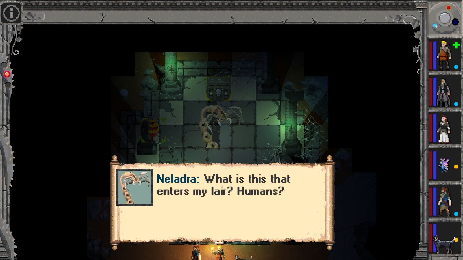 All of these abilities and pieces of gear are a means to an end: to win at combat. So, how does the combat hold up? Well, it can be both deep and painfully repetitive. Here’s why. Enemy encounters are nearly constant in Caves of Lore. As you walk around the world, you might run into monsters, or they you, and if they make contact with one of your party members, you engage in a fight. It does lead to some fun moments reminiscent of the game Snake, where you’re trying to maneuver your conga line of party members to avoid the enemy. However, there were times when I would fight off some monsters, take a few steps, and fight some more, and then I would get a third encounter right after. Mind you, each of these fights takes a good few minutes to win. Sure, you have the option to stealthily avoid enemies, but then you lose out on XP, monster lore, and items, and in the early through mid-game, that’s not exactly a winning strategy.