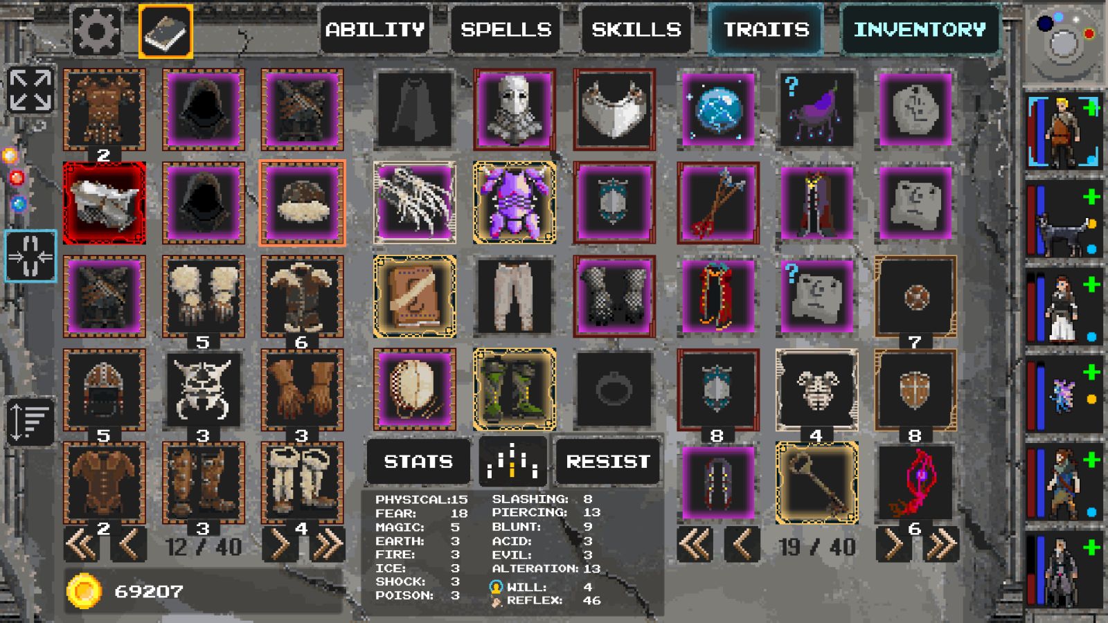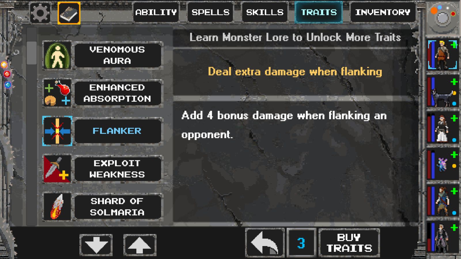 Traits are your typical passive stat-boost fare that comes with the territory of RPG games. There’s one for every type of weapon and magic available from the get-go. Beyond those, you need to accumulate enough of the aforementioned monster lore to gain the ability to buy new ones. Once you learn enough about a monster, you’ll unlock a new trait buy. These add some real spice to your party builds. Backstab damage, higher critical chance, wielding a two-handed weapon with one hand, better mana recovery, and many more are all on the table.