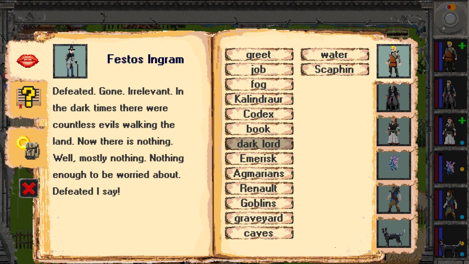 Speaking of the plot, the story is largely told by the various people you meet across your travels. It’s a typical tale with heroes and a dark lord, but what throws a monkey wrench into the triteness is that people have their own accounts of what’s happening. Many of the explanations or anecdotes you’ll receive conflict with each other. Combine the confliction with the memory loss, and you have the recipe for a strong mystery. Who were the nobles of the area? What was their legacy? What did the dark lord do? Did he even exist at all? All of these questions swirl around in a chaotic soup, really lending to the themes of memory loss and disorientation.