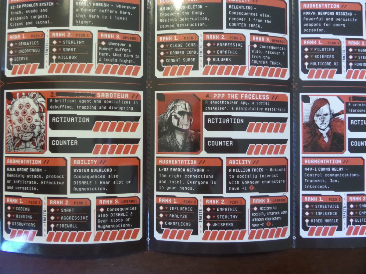 CBR+PNK has rules for cyberwear, equipment, and magical abilities in one of the supplements. The main mechanical draws come from glitches, flashbacks, and angle rolls. Negative consequences could inflict glitches, making one of your dice less effective. The angle roll comes in at the end of the adventure, summarizing where your character goes next after this job. Flashbacks are a callback to FitD’s heist origins: in a bad situation, you have the option of cutting back to before the job started, to explain how you prepared for this problem. Probably the most controversial feature, this cuts out the planning phase of the heist. You start right at the action, and work your way backwards as necessary to keep things moving forward.