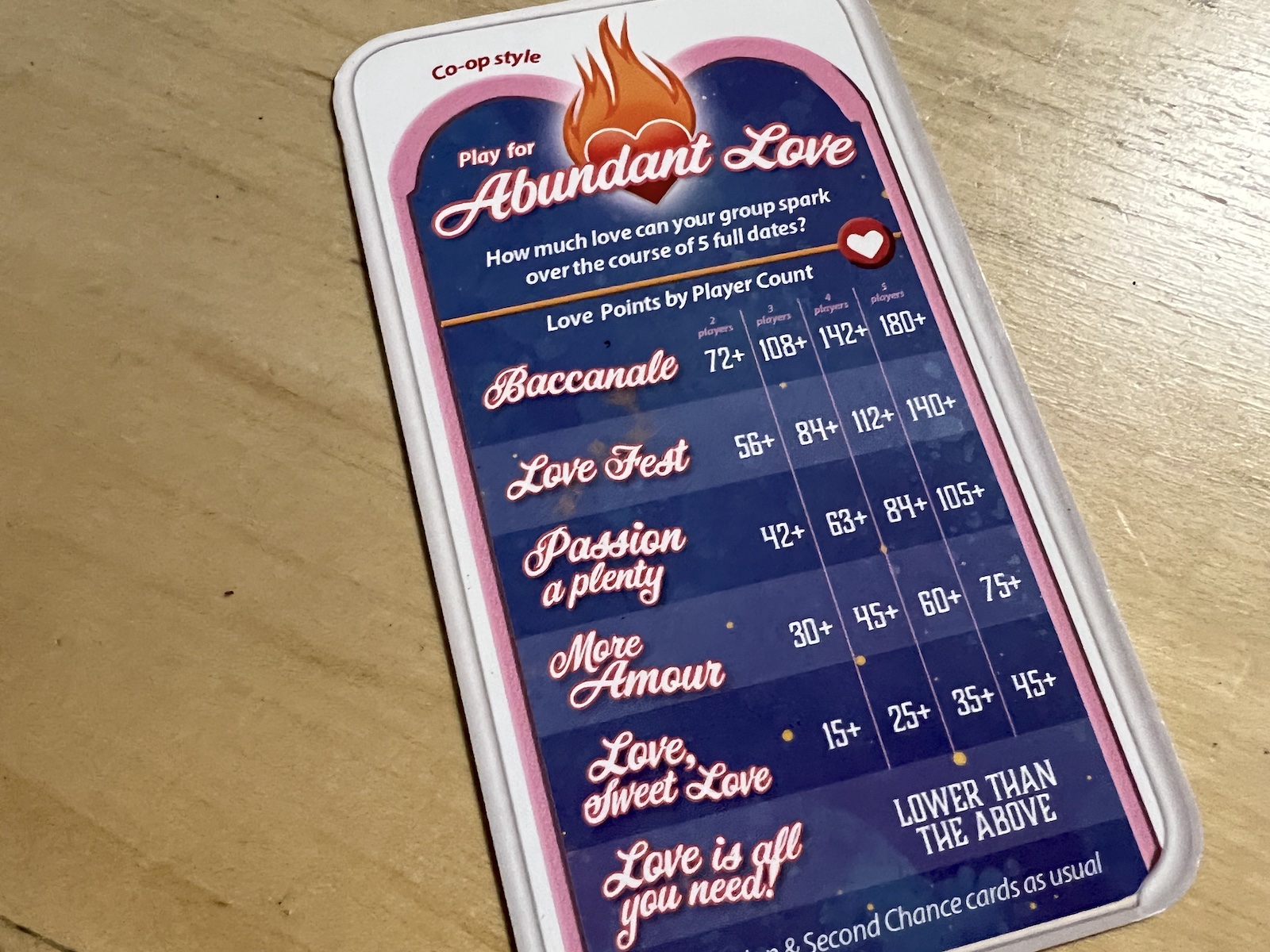 However many heart results you rolled in total throughout your date is your score for the date, plus any bonuses. Don’t despair if you get burnt by your date, you’ll get a second chance card that will let you re roll some number of dice on a different date next time. First to 21 points wins. This game can be played co-op or competitively. We choose to play competitively. You can steal dragons from each other, and occasionally cause other players to lose points. The co-op version has everyone go on 5 dates and your group score is totaled and judged. There is also a solo variant if you want to play by yourself, but I didn’t have a ton of fun playing that way. This is game that is more suited to be played with friends you can laugh along with.