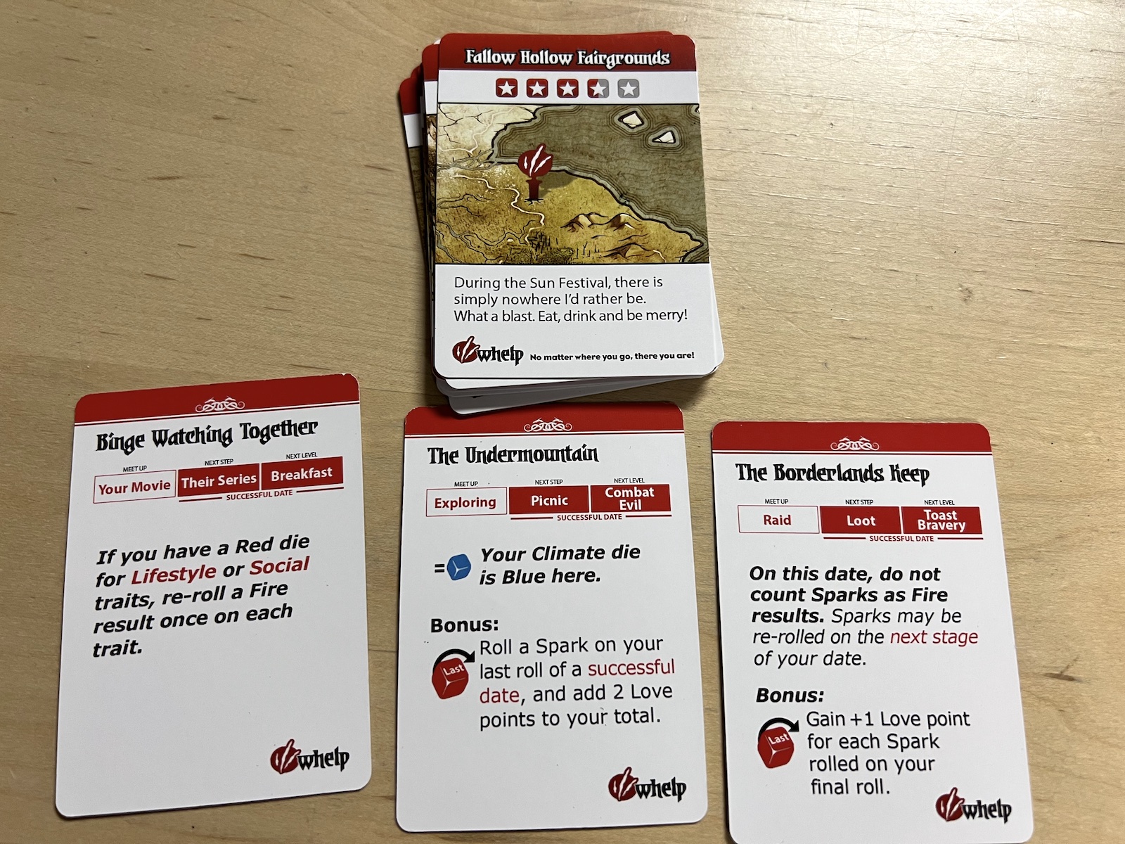Now on to the date! You will flip a date card and attempt to go on a three-part date with your dragon. The date location may lead to some dice changing or other things happening. The first part of the date is the “meet up”. You roll your 4 dice, and any flames get put to the side and hearts will count as love points. You can stop after the first part and bank your points, but your date won’t be impressed enough to stay around in your personal dating pool and will leave. If you want to continue to the second part of the date, re-roll your heart dice and like before, put any flames aside. 3 flames and you’re out! If your date has gone badly you will score no points. At this point you can choose to end the date and score your hearts so the dragon will stay in your dating pool, or you can risk it and go on the third and final part of the date, which may score you even more bonuses.