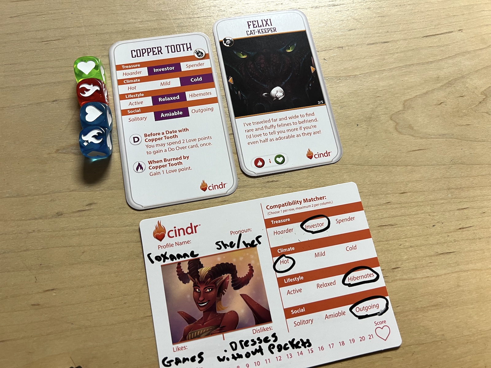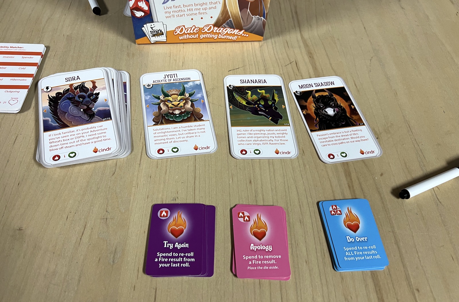 The game is played using one of the provided dry erase character sheet profiles of your choice and a variety of cards and dice. You have a lovely assortment of humanoids to choose from to play as. Some of us had a ton of fun writing silly info for our character’s dating profile, but others were happy to just quickly fill the dry erase profile out and get to the game. You also pick your compatibility traits, which will be what you are looking to match with the dragon of your dreams. On your turn you will have a selection of potential dates to “swipe left or right on”. The front of the dragon cards features a little fun bio about your potential date that gives you some clues as to your compatibility, but you won’t be sure how well you match until you pick one for a date. Once you’ve chosen the dragon of your dreams, you flip the card over and see which traits you match on. Matching the trait will give you a green die (the best one), while being off by one will get you a blue one. If your traits are opposite, you will receive a red die. Each dice has a different number of hearts and flames depending on the color. Each dragon also has 2 special abilities as well that may change what or how many dice you roll, or give you some bonuses that may help score more love points.
