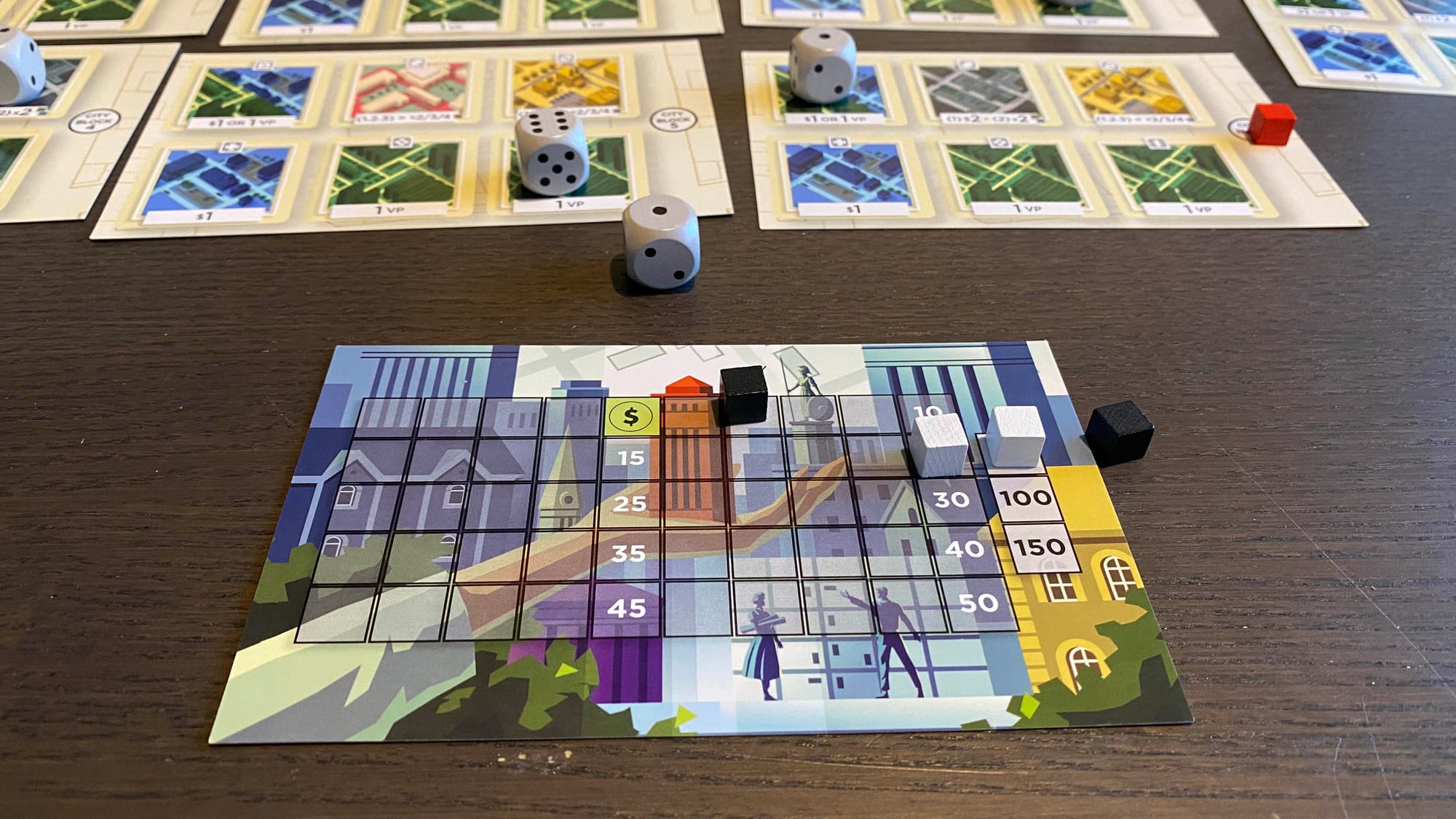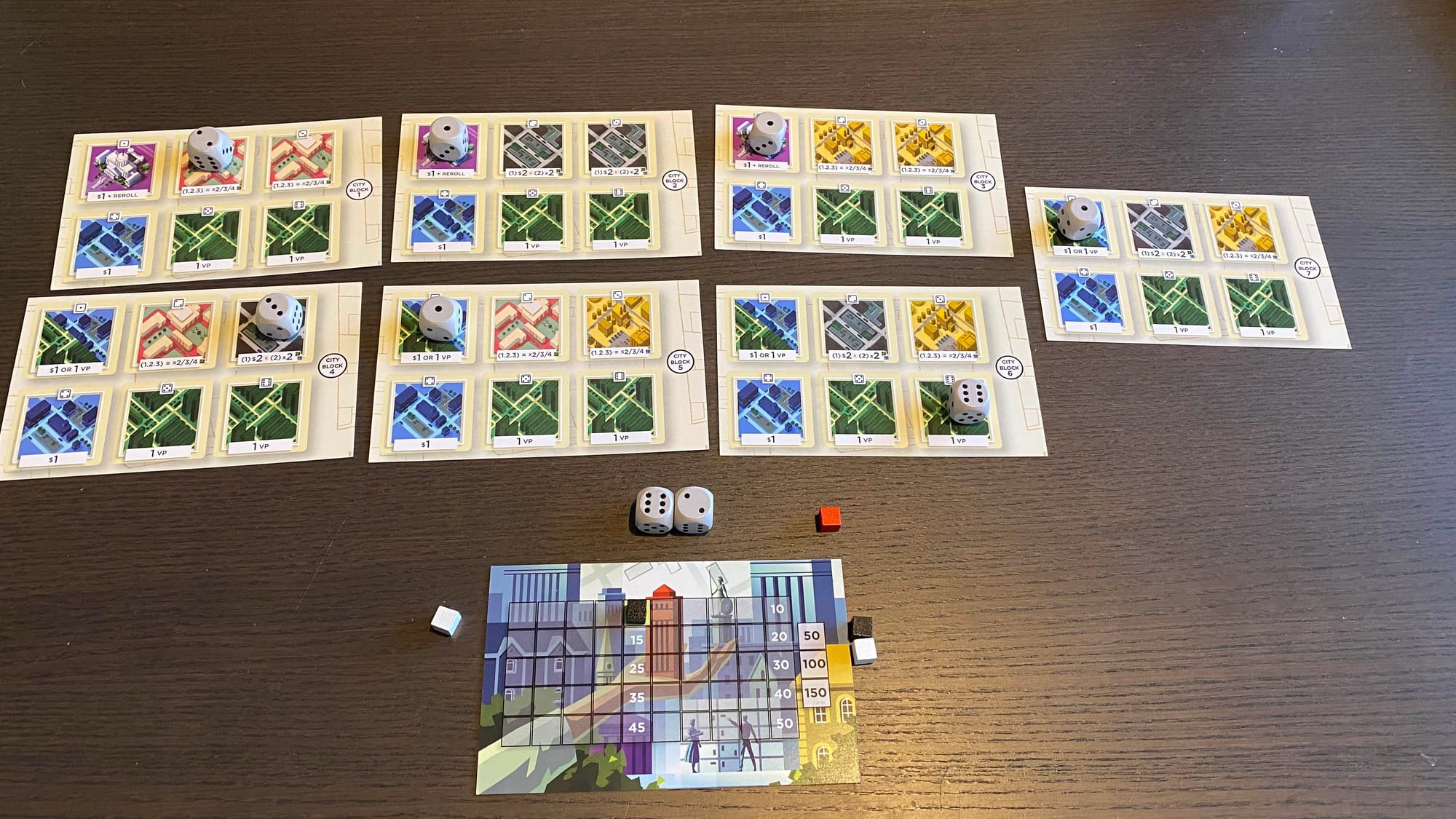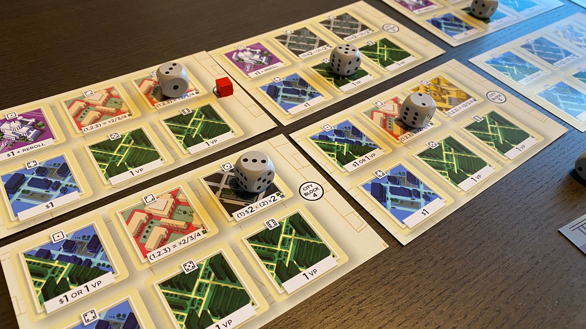 The two-player version of the game is better, but only slightly. Everything is exactly the same, but the locked City Dice Block is locked for your opponent instead of your next turn. So there's some slight take-that if you lock a card onto a "bad" building. I tried to consistently lock the cards with several point multipliers onto the Blue money buildings instead. But this again falls into the same issue where none of the decisions felt meaningful, as there was always an objectively best play. The only saving grace is that the game isn't broken in any way, and its fast, simple play could make for an okay filler game if there's nothing better available.