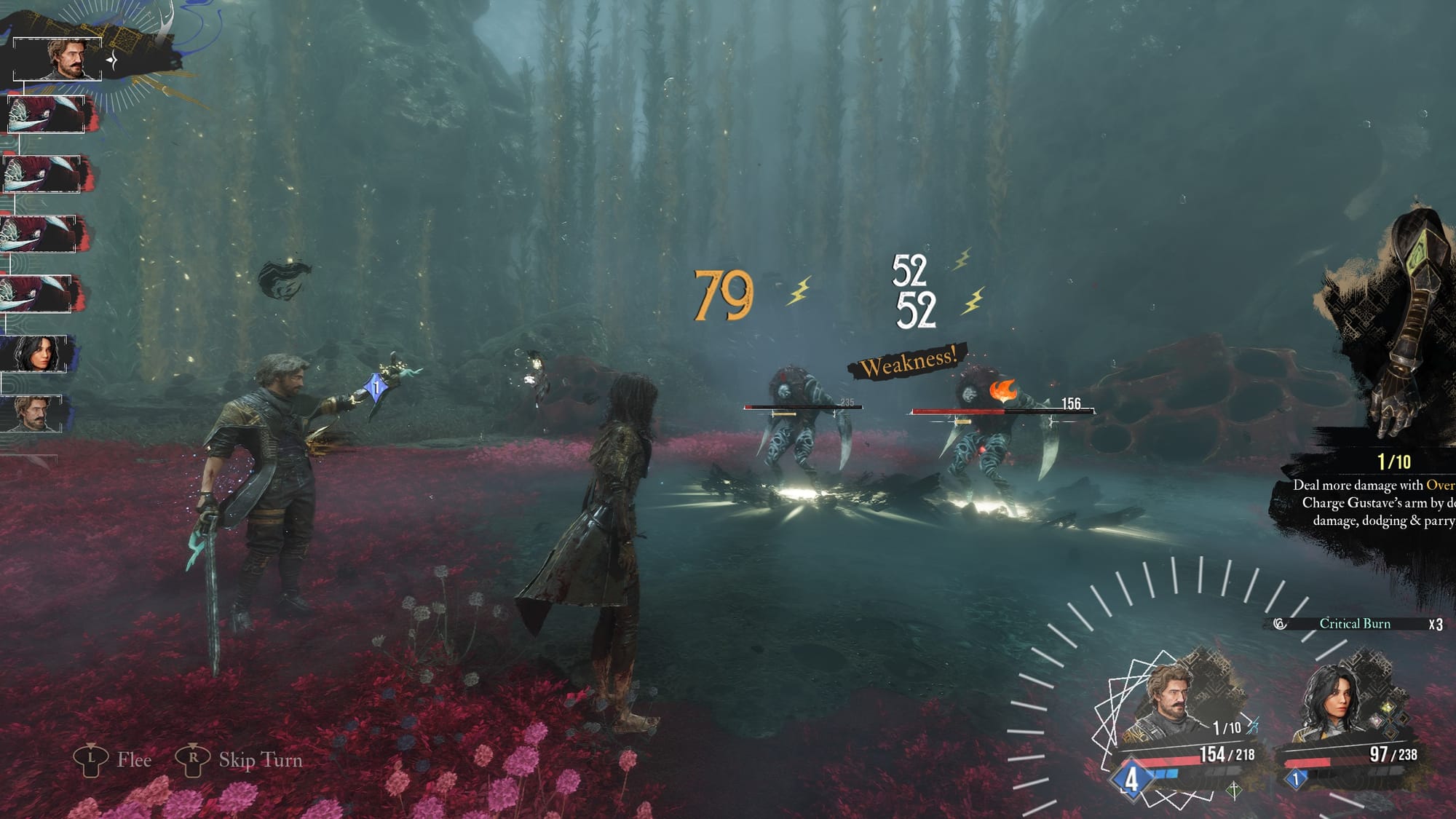 All of the intricacies of Expedition 33 and its combat really start to come together at the mid-portion of the game, where you begin to not only level up your gear, skills, and perks (pictos), but also discover the weaknesses of enemies. As with something like Pokémon, each of these enemies has different strengths and weaknesses. If I hit one of the Flying Water enemies with Gustave’s Overcharge lightning ability, they are going to get fried for a ton more damage. The opposite occurs if I hit a dark enemy with a dark attack – even if it’s one of my stronger skills, I won’t put the same dent in. The balance between it all is a masterful dance crafted by Sandfall Interactive, forcing you to move around not only your skills, but different party members as you go. This isn’t a game where you’ll throw in your best three and only use them; you’ve got to find places to work everyone into the lineup and level them up – same with skills, gear, and pictos.