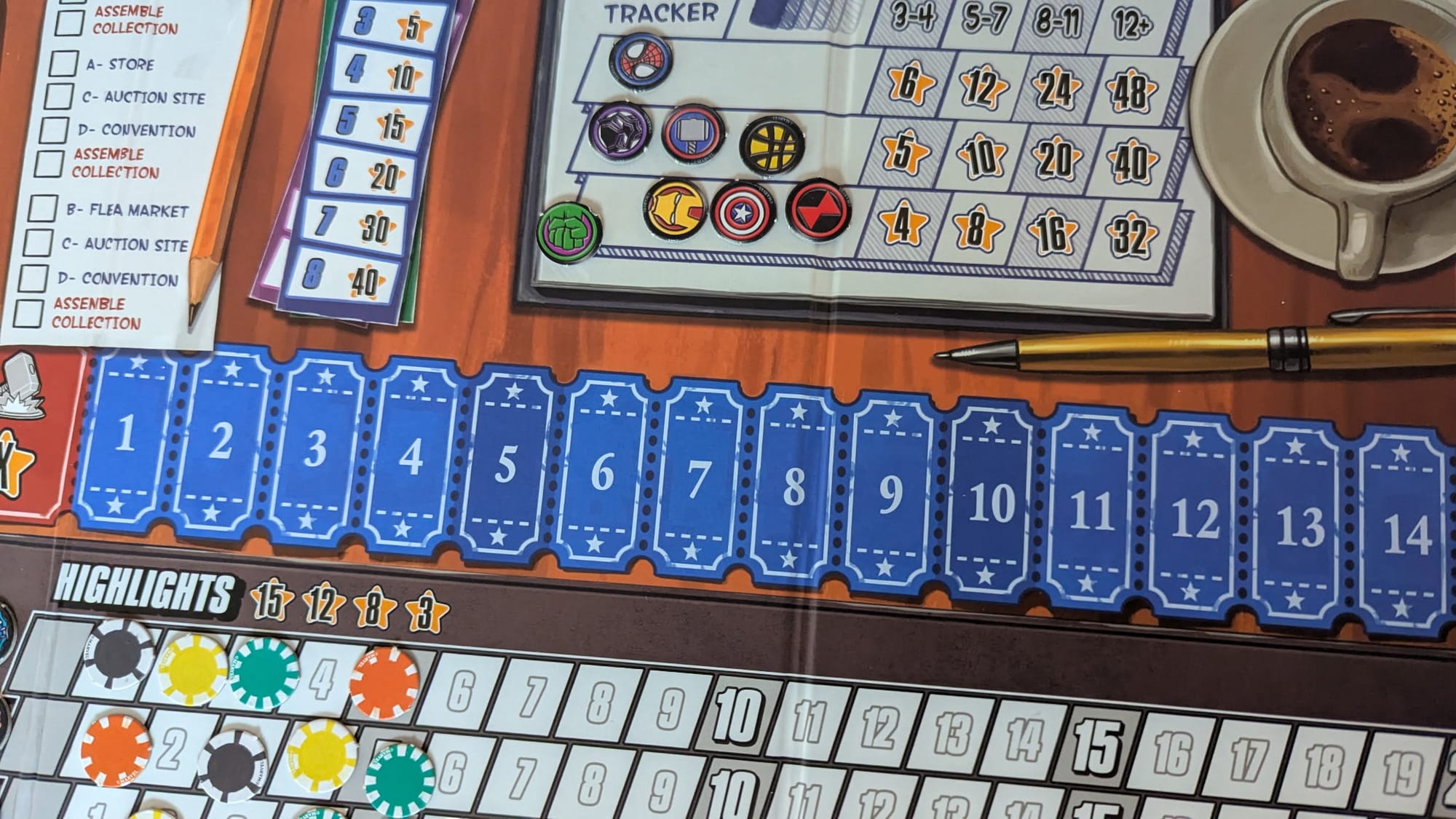 Comic Hunters is a set collection game played over 3 rounds where you build your comic collection, competing with other players for majority scoring in categories like 1st issues and new costumes while also managing your heroes. Hero scoring does one of my favorite things in board gaming, where players are expected to find the sweet spot of the bonuses for large individual hero collections and diversity, but that's not the only thing I love in this box. Comic Hunters’ rounds play as a set collection “best of” album, with cards being doled out in multiple varying phases that keep the game interesting and fresh. You've got the bog-standard draft, a Coloretto-style pile brinkmanship minigame where players take turns either drawing a card to add to a pile or grabbing a pile for the phase, an auction, and picking up all of a hero's cards in a grid's row or column. Gameplay-wise, the theme doesn't stretch too far beyond “comic collection is set collection,” but the theme does allow the Marvel license to do some Hulk throwing tanks around level heavy lifting.