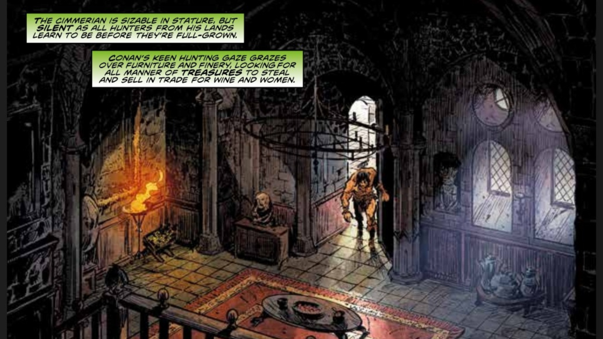 As stated above, this adventure shows us a different version of the character than we saw in Battle of the Black Stone. There, we saw Conan as a seasoned warrior who had already become a legend. Here, he’s a youthful 17, driven by wanderlust and worldly pleasures. The only problem is that he has no money to his name. So what is a Barbarian to do? Get a job? Learn an honest trade? (Jim, there’s your next story, Conan the Accountant.) No, he decides to become a thief, utilizing his already impressive skills to break into the home of a local noble. A simple task for the Barbarian. However, what he finds there promises to have long-reaching effects that Zub teases will echo through the ages.