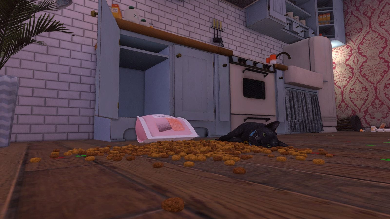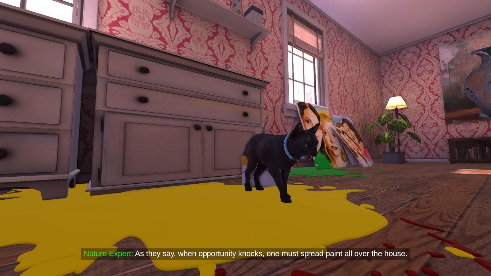 That said, I think Copycat may feature the most realistic cat yet in gaming and is clearly made by individuals who adore cats and have extensively studied how they interact with the world around them. You’ll knock items off tables, steal food from your owner, dig in the trash, play with toilet paper rolls, spread paint all over the house, sleep, hiss, meow, and get easily scared. I think this attention to detail is what really endears us to Dawn, our cat protagonist, and her struggles to understand the situation she is adopted into.