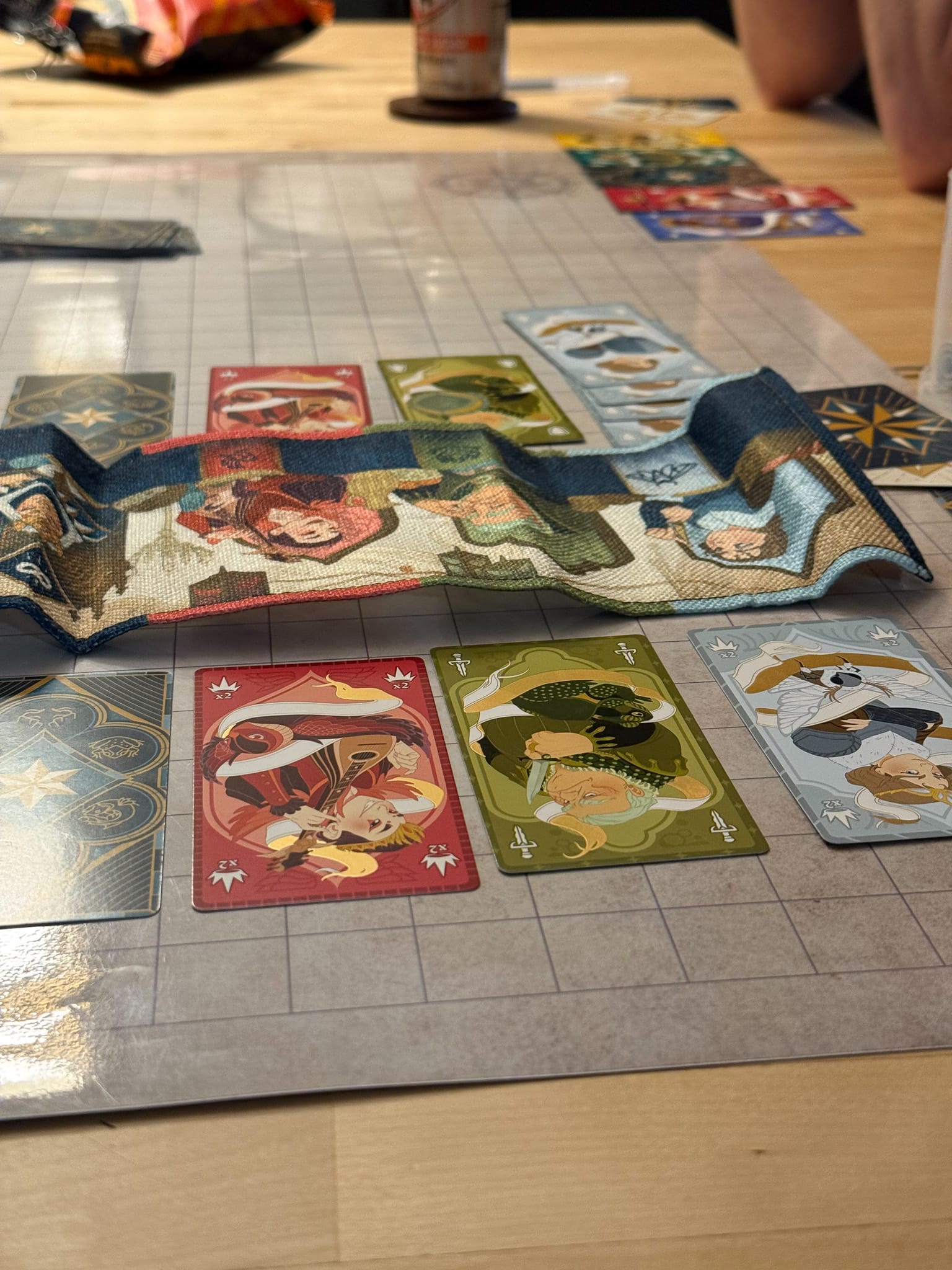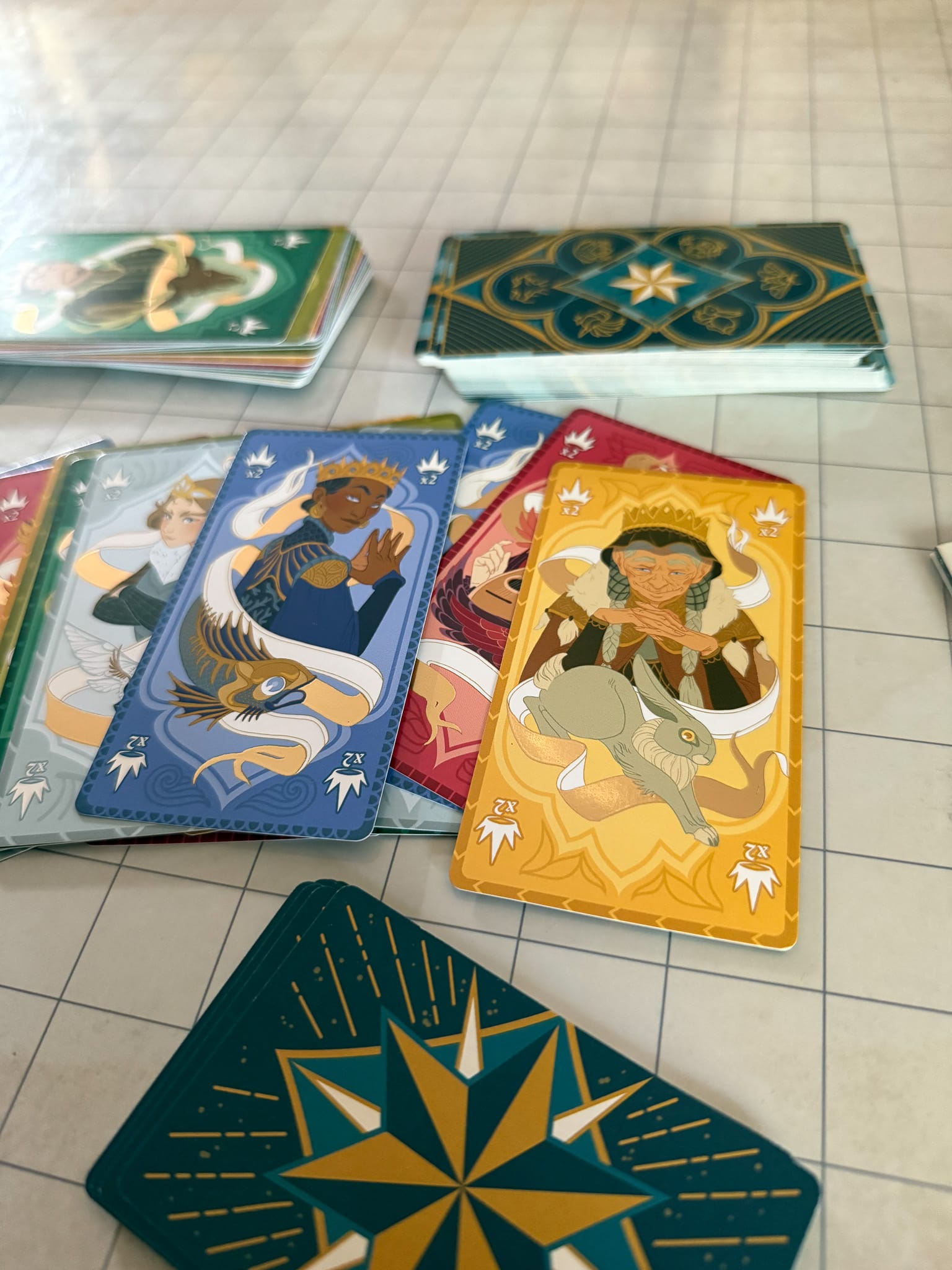 The game is packaged in a standard small box, making it ideal for travel or storage. Inside, you’ll find beautifully illustrated cards with a gold foil treatment, which makes them feel extra special. The “Queens Table” is just a cloth covering, which is the only downside to this game. The material feels extra cheap, is wrinkly, and the illustrations on the cloth suffer because of this. If the mat was made from mousepad material, it would’ve been a better choice.