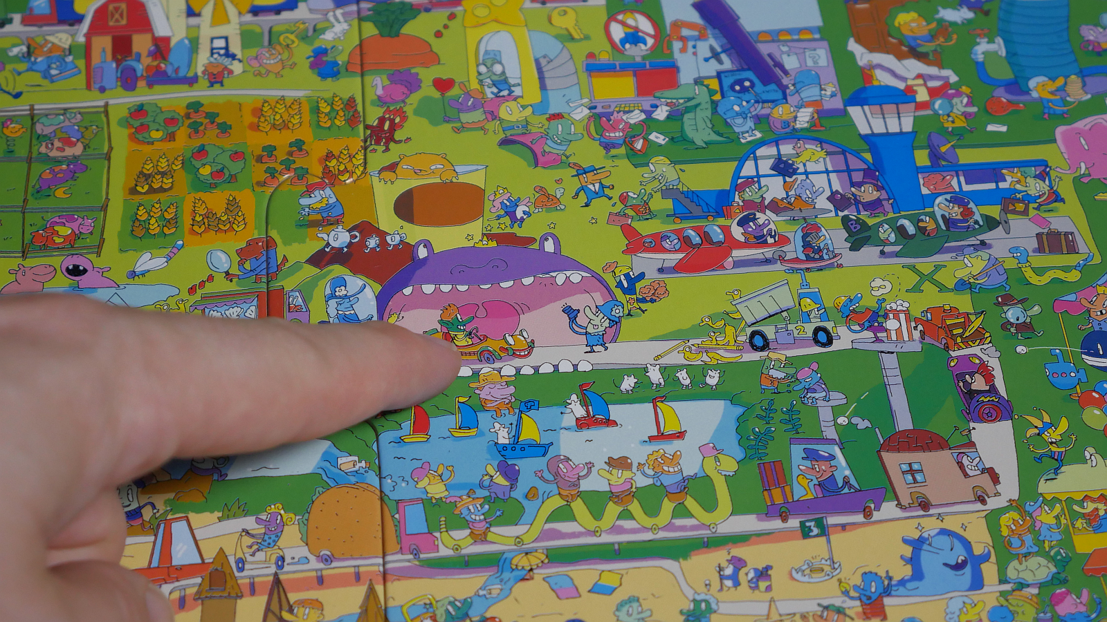 The board is absolutely covered in wacky and fun artwork that all links together to form a cluttered and chaotic world featuring unique and themed zones. There is an underwater road that exits through a whale’s mouth and then links up to a highway that heads into a volcano, which leads to a cloud world sitting in the middle of the steam rising from the volcano summit. This goes on and on. It’s a lot to take in and does an admirable job of hiding the mystery answers while providing distinct landmarks to ground the clues around key features. There are tons of fun details to discover as you search out the Big Brain Mysteries.