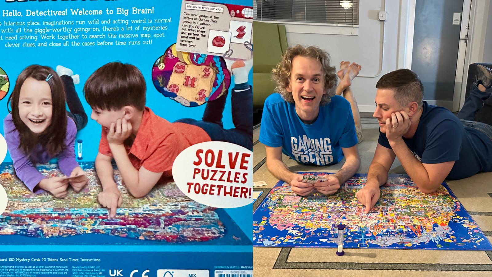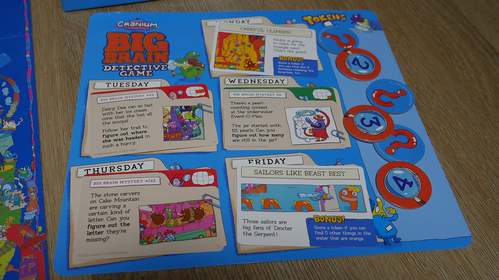 The clues, or Big Brain Mysteries, have a range of complexities and an excellent amount of variety to keep the players engaged and thinking. Some are simple “find this thing” type cards. Others might show you a picture that is linked to the thing you need to find and come with an associated riddle or story hint. Regardless of the difficulty, all of the cards feature a small outline of the board that indicates which section of the board you need to be looking in, ranging between one to three sections of the twelve divided sections.