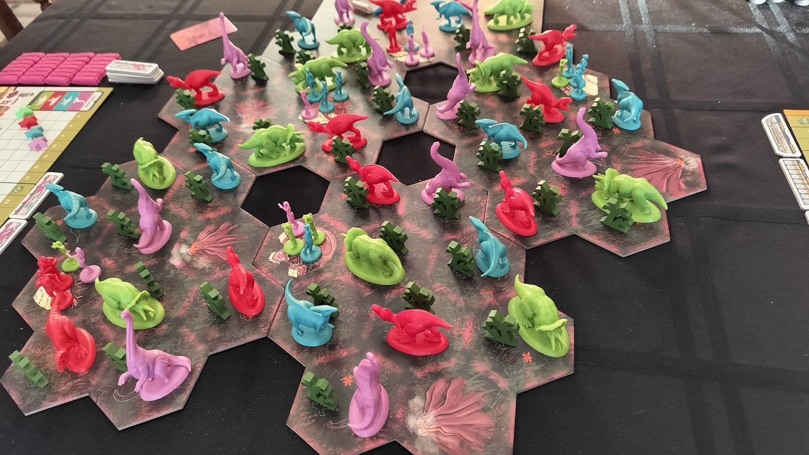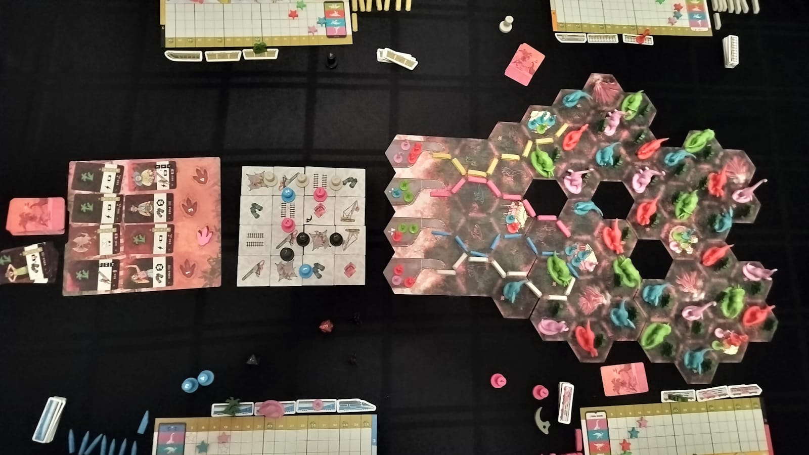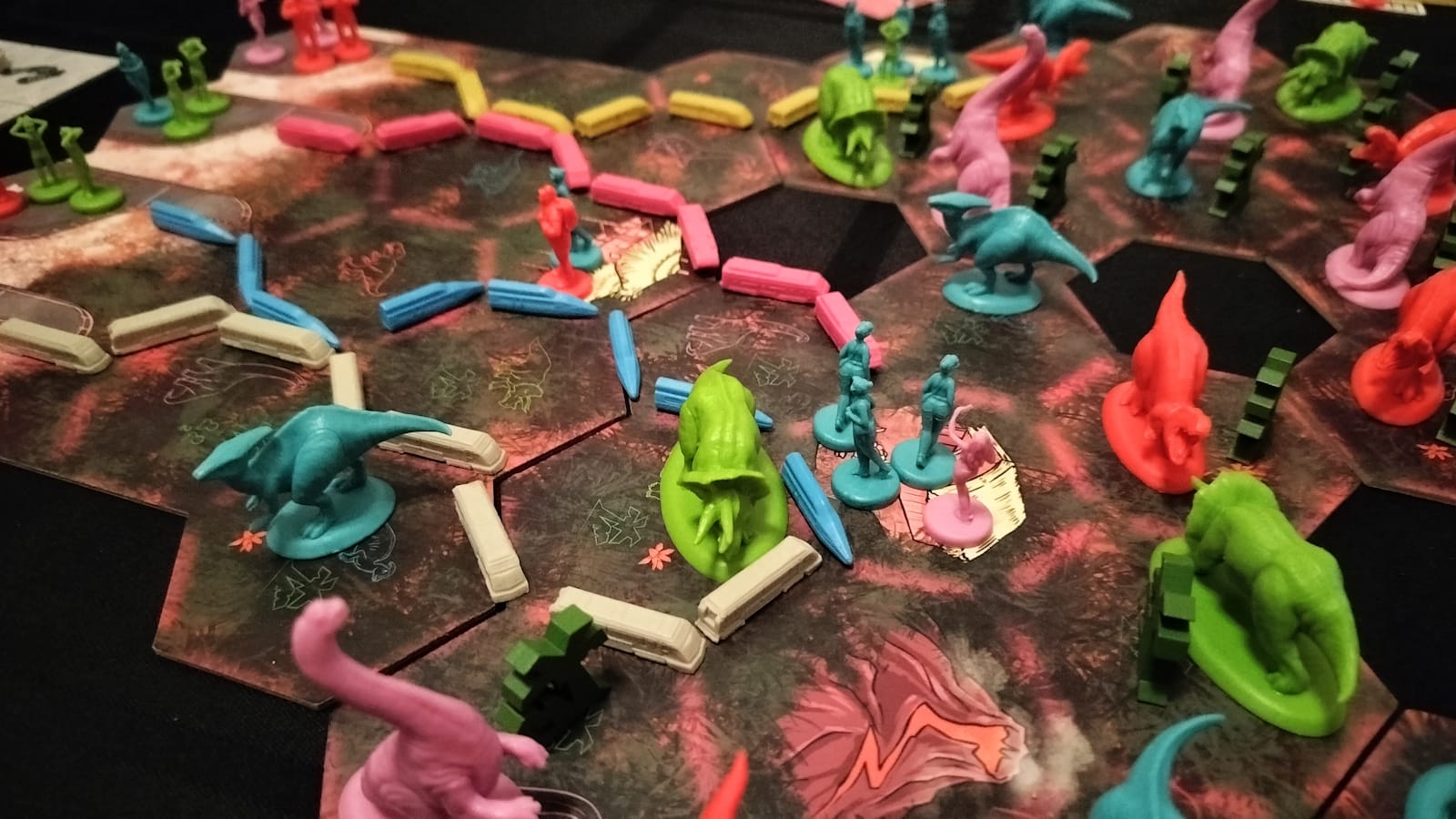Cretaceous Rails has an amazing board presence. The theme in and of itself is basically Jurassic Park meets Ticket to Ride, which makes it an easy sell to new players. The trains are unique to each player, from the Japanese tourism company having a Shinkansen-style mag-lev train, to the American-Midwest camping company’s old school box-car looking trains. Each faction’s board also has a different vibe, such as the Vegas high life styled Dino-Lux company. The plastic dinosaur and tourist pieces are very cool, as well, and at the start of the game, the board is bristling with these gorgeous pieces, and are gobbled up as the game goes on.