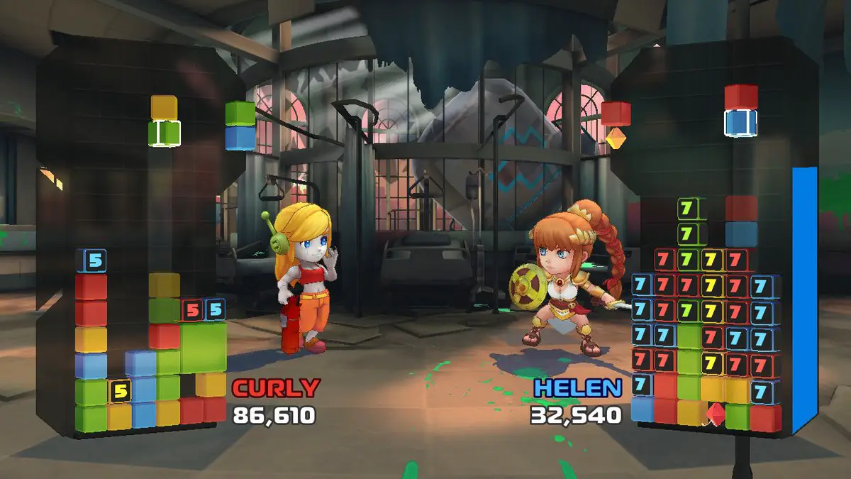 Regardless of which strategy you adopt, though, clearing blocks will fill up your special meter which can be unleashed either defensively or offensively. Using your special defensively will allow you to reshape your board in one way or another, whereas using the special offensively allows you to reshape your opponent’s board. Each special is different depending on which character you choose to play, and while this is interesting conceptually, it feels rather unbalanced in execution. Some characters have special moves which simply don’t feel as useful as others, thusly I’ve spent the lion’s share of my time in Crystal Crisis with Curly as I find her special to be a near trump card. While others have rather situational special moves that can come through in very particular circumstances, I haven’t found any reason to adopt several of the roster’s characters because their specials simply aren’t useful enough of the time. Beyond the issue of unbalanced special attacks though, the gameplay in Crystal Crisis is fundamentally solid and largely enjoyable. I found myself constantly engrossed in the puzzle strategy, often entering into the same sort of hypnotic trance I find myself in during a particularly intense game of Tetris 99. While the gameplay is roundly well-executed, the presentation and technical aspect of Crystal Crisis leaves something to be desired. The game has a cartoonish style that pops with bold character designs and saturated colors but looks decidedly flat with a lack of texturing and lively backgrounds. However, that simply leaves the game’s aesthetic feeling inoffensive, not particularly bad.