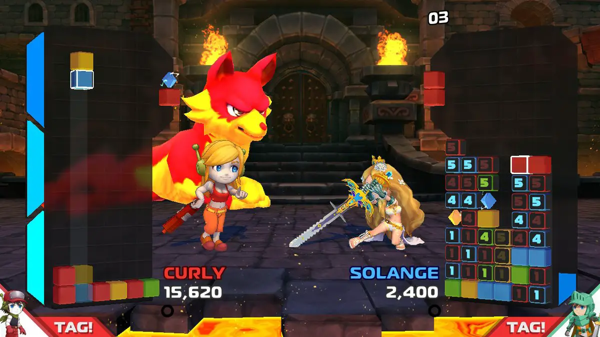 The setup of Crystal Crisis isn’t particularly compelling—there’s a powerful crystal, and it’s causing a crisis. However, considering that Crystal Crisis is first and foremost a gameplay experience, the lack of an engaging narrative thrust only becomes a point of contention in story mode—which we’ll get to soon enough. The crux of the experience is the gameplay, and fans of puzzle titles such as Puyo Puyo will find it familiar yet unique enough to feel fresh. Upon picking your fighter from the game’s roster, you’ll square off against another character in a best of three block-dropping beatdown. Colored cubes will fall from the top of your field in twos, and your job is to arrange them together by color as you rotate the falling blocks and wrap them around the edges of the screen to land them in optimal positions. While it’s a fairly staid concept for a puzzle title, Crystal Crisis’ conceit is that blocks don’t disappear automatically when a certain number are chained together—instead color chains have to be manually broken by dropping a like-color crystal onto them. This causes the blocks to shatter on your board and be punted to the opponent’s field. However, unlike Tetris or Puyo Puyo, your opponent doesn’t receive junk blocks, but instead regular blocks locked behind a timer. Once your opponent has dropped a certain number of their own blocks after receiving a tumult of blocks from you, your barrage will revert from locked, timer blocks to typical colored blocks for your opponent to use.