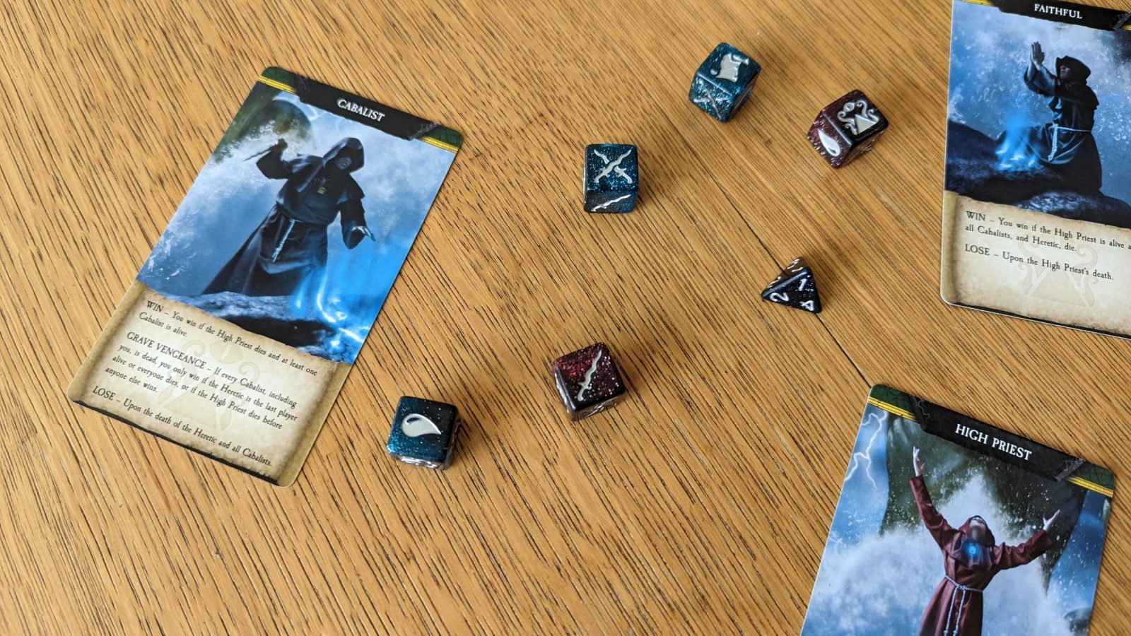 Cult of the Deep unapologetically apes the sheriff and deputies vs outlaws format of BANG!, but makes good use of the decades of advancement in game design to file down its rough edges. Right out the gate, every die result has to be assigned, so players are forced to immediately start stabbing each other, fixing the slow, boring opening while everyone tries to feel outsides without hinting at their own. Gone are the obviously terrible horses and various forms of cover, which could and did bring the game to a standstill. Taking their place are rituals, which grant temporary boons to players who assign dice to them, occasionally rewarding the player who finishes them with special powers. Again, instead of stalling defensive plays, the majority of these mete damage around the table or allow players to mess with each others’ dice. Similarly, characters are now more often yet another source of damage, speeding up the game yet again.