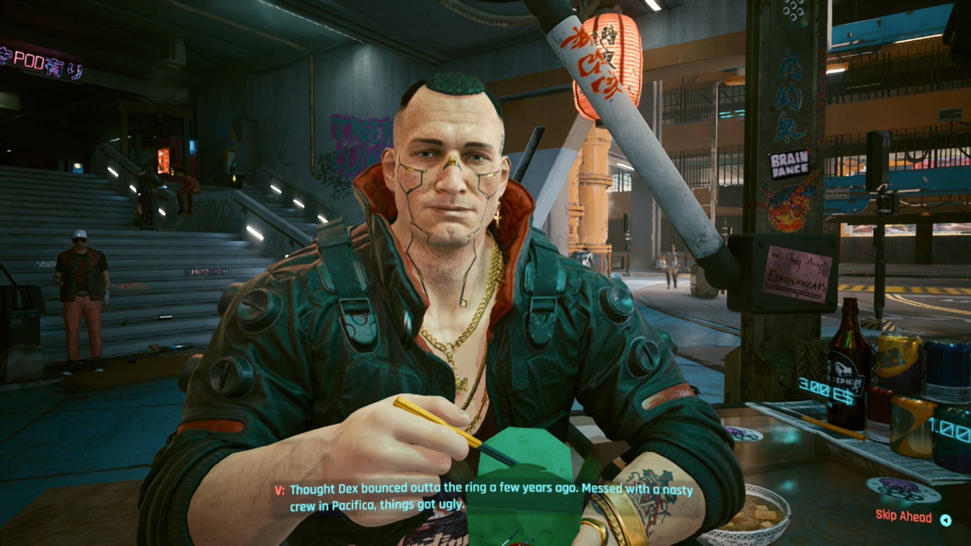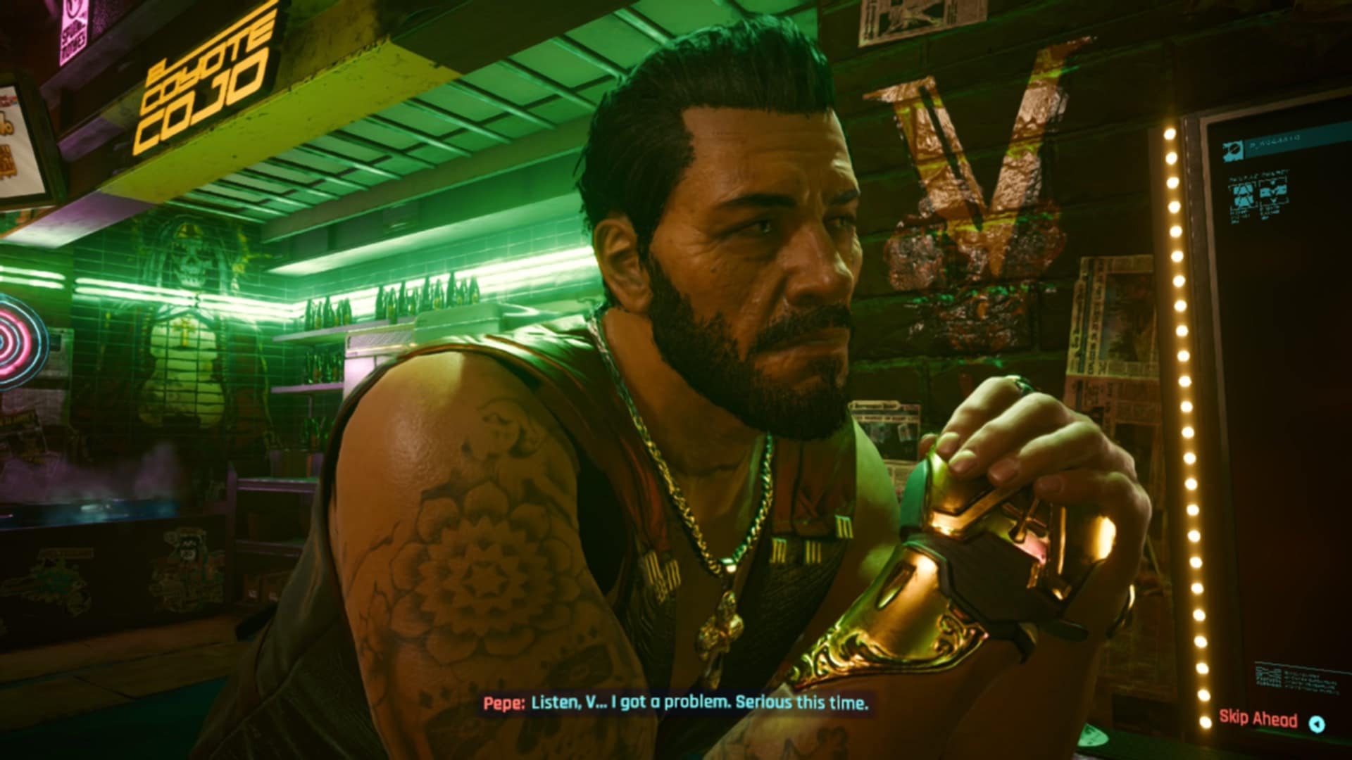 Something truly impressive has been the fidelity of Cyberpunk 2077. It’s a pretty game with a well-designed aesthetic, one which also doesn’t have to be as shiny as others with the sharp neon color – although it definitely shimmers when the bells and whistles are active. Even though the resolution definitely takes a hit, with textures getting muddy in the open world areas, when you get close up to some of the characters, or with some shadows, it’s astounding how good it looks. Just take a look at the collection of screenshots above. Those are gorgeous textures. That said, just like the other versions of the game, character model quality does slip when they aren’t as important to the narrative.