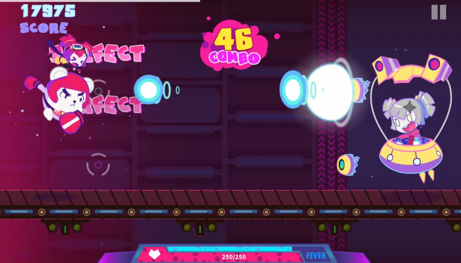 Muse Dash is a simple game: your character is endlessly running in side-scrolling levels while projectiles and enemies come at you from the right side of the screen. There are two circle crosshairs in front of your character: one at ground level and one just above the ground one. One button causes you to attack the ground crosshair, while the other makes you jump and attack the mid-air crosshair. You’ll want to time your hits to match when objects or foes enter these crosshairs. Don’t worry, you won’t only be using visuals to accomplish this. Your targets will typically arrive at the crosshairs in tandem with the rhythm of the song. Obviously you’ll still want to look to see what you’re hitting and when to strike, but the beat can be an incredible help when trying to time your hits.