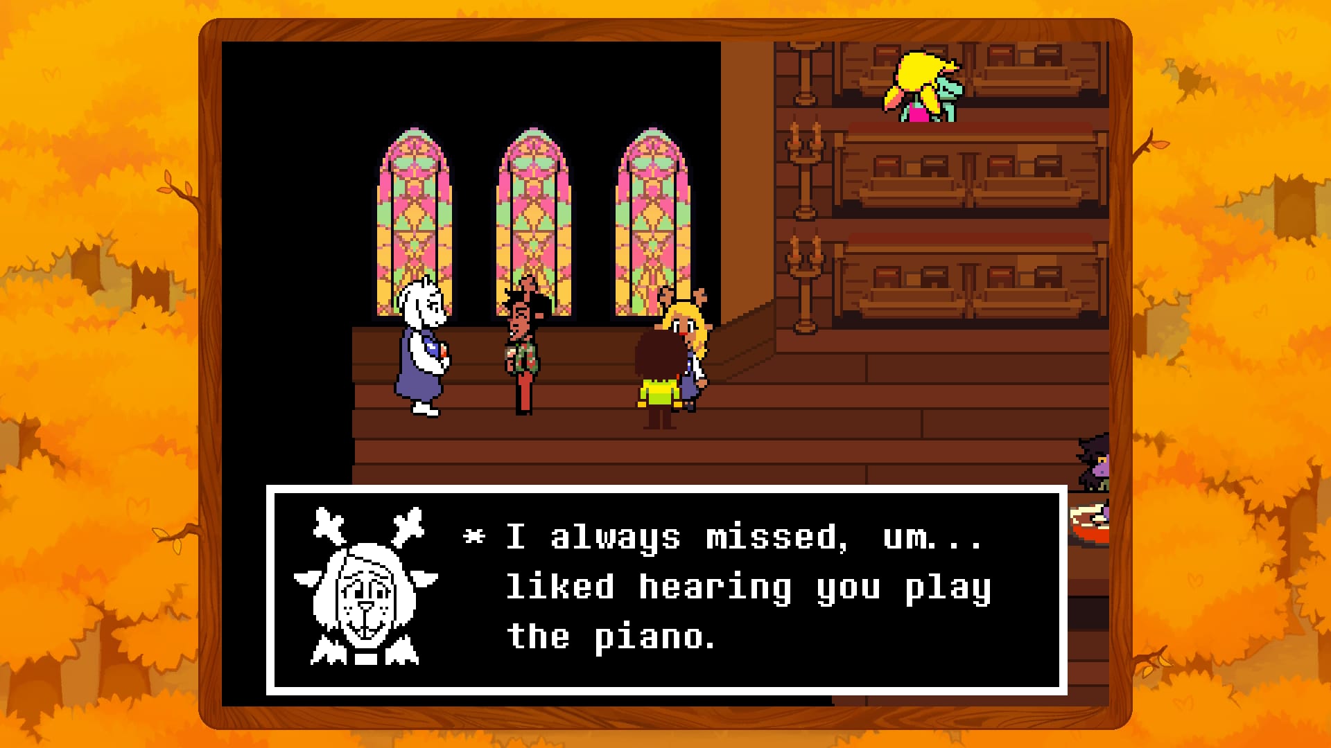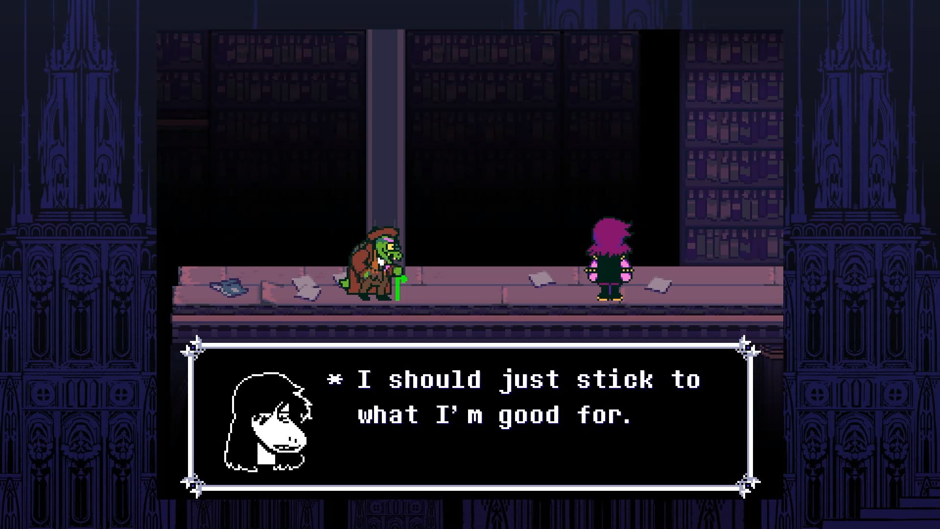 These questions pave a cold segue into Chapter 4, its church-inspired setting presenting a more balanced glimpse into Deltarune’s world. From broken families, to post-mortems, to apocalyptic boss fights, it raises the stakes by putting the party’s bonds to the test, not the least in its character study of Susie. While the unrestrained anarchy she’s displayed suggests a free spirit, the deep baggage we’ve long suspected her to carry impeded her desire for connection. Each consecutive trip to the Dark World represented a step outside the self-imposed shell guising her tough girl exterior, and from tender study sessions to pushy octogenarians, she’s fully come into her own as the game’s true star. (Really, the budding relationship between her and Noelle? Adorable.)