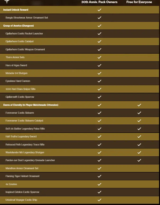 Destiny 2’s latest content drop is a special one. Rather than being tied to a specific narrative beat, or a progression of the story, The Bungie 30th Anniversary Event is about meditating on the players’ journey with Bungie so far. With nods to just about all of Bungie’s created IP (with the possible exception of Oni), this event does come across as a celebration of Bungie’s best and brightest. For consumers looking to get in on the action, however, there may be some initial confusion as to what is free-to-play and what requires the purchase of the 30th Anniversary Pack. Here is a handy graphic straight from Bungie that makes everything crystal clear.