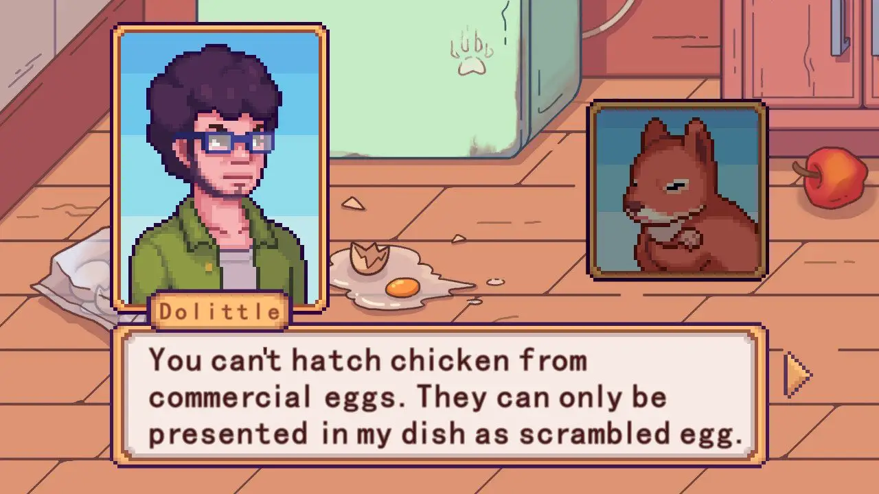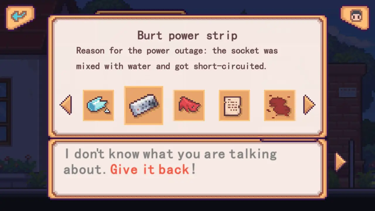 Unfortunately, a good premise alone doesn’t make for a great game, and Detective Dolittle is held back by its linear structure and underused mechanics. The game is played in a point-and-click/Ace Attorney style, where you can investigate crime scenes and interact with different objects. Sometimes you’ll get evidence that you can put in your inventory as you explore, and different characters will give testimonies. It’s up to you to find contradictions in their stories in order to advance the plot; unlike Ace Attorney’s court segments, there’s no penalty for presenting the wrong piece of evidence, so “try everything until it works” is a strategy for those who might not understand what to do next.