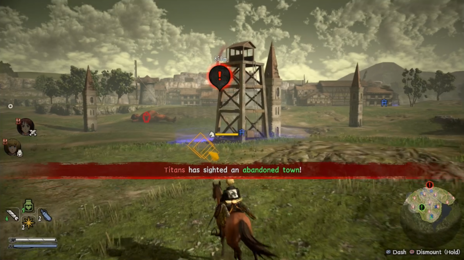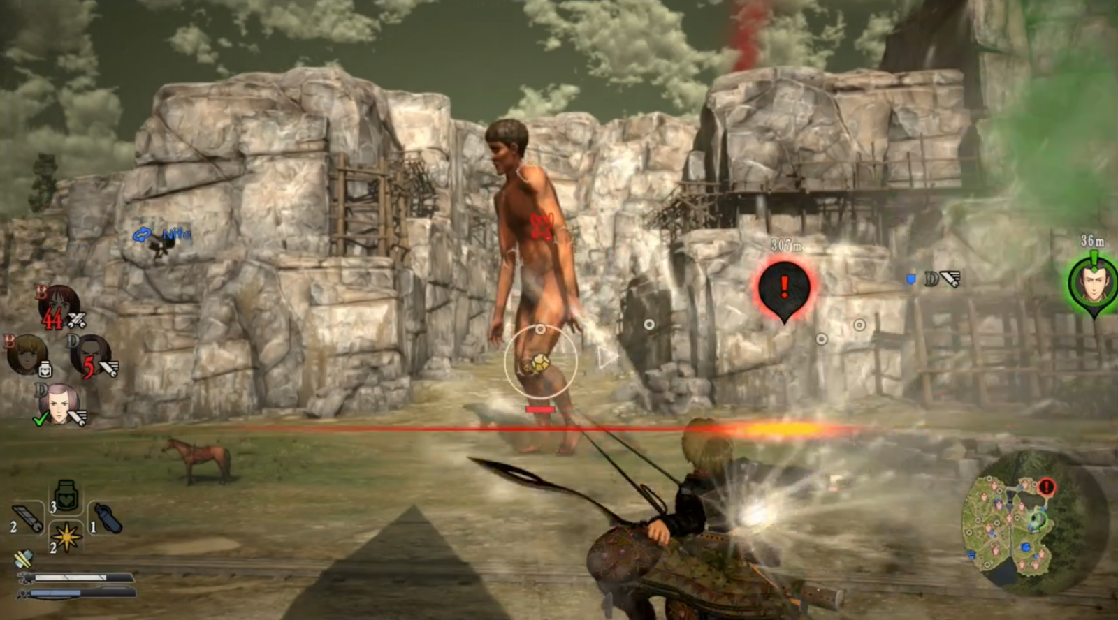 Another important aspect carried over from the series is blade durability and gas supplies. You can track them via meters in the bottom left corner of the screen that you need to keep an eye on. Above those are your supplies that you can refill yourself with. When your blades get too dull, you need to take a second to swap them out for new, sharp ones. When your gas canister runs out, you need to take a few seconds to swap in a full canister. Not changing your blades results in you doing little to no damage from attacks, while running out of gas drastically hinders your ability to traverse. You can still use ODM gear to move around, but you won’t be able to boost or increase your speed.