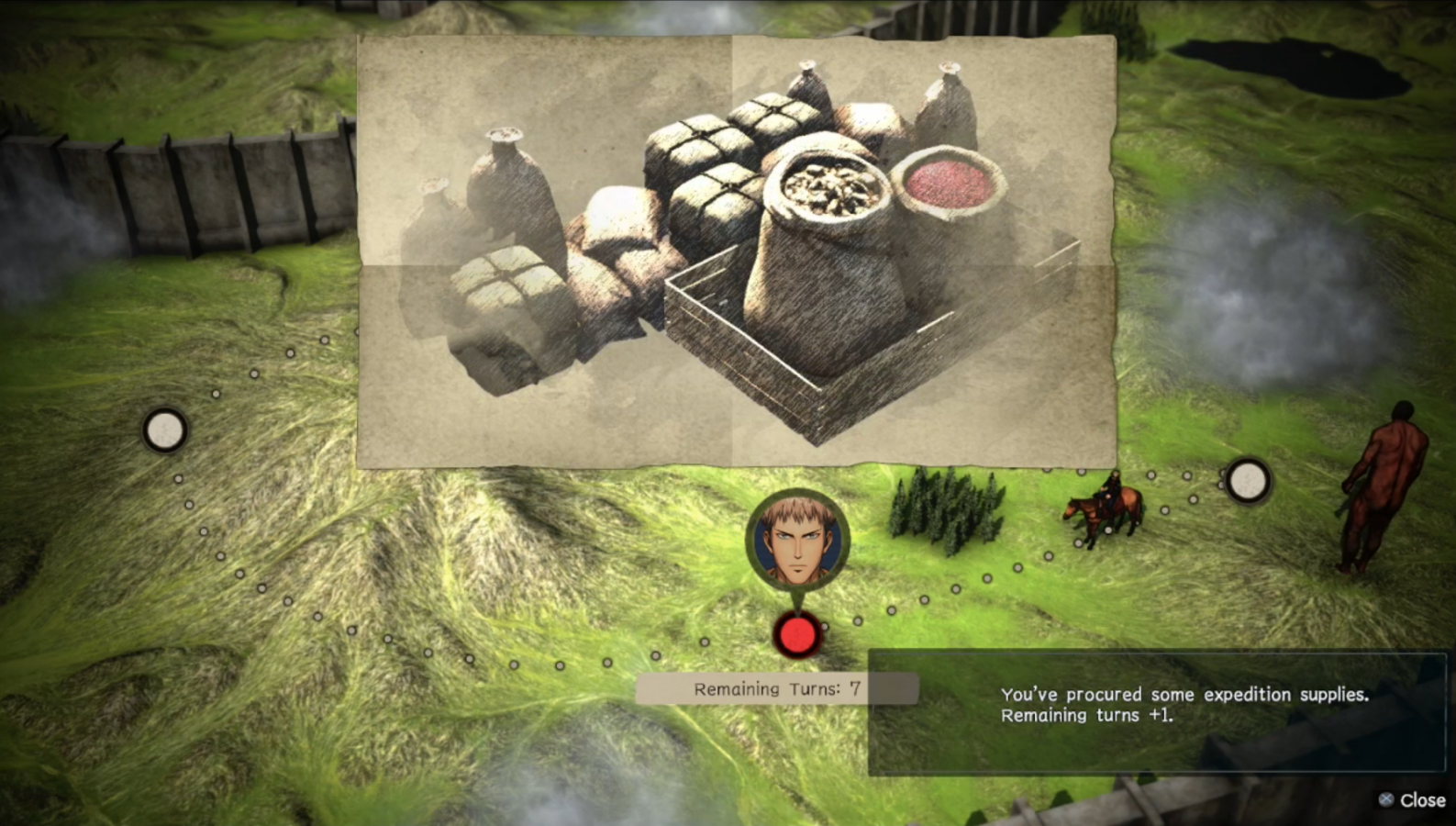Story mode doesn’t just go from one battle to the next; there are hub locations to explore, characters to talk to, shops to buy from, and scout missions to embark on. Exploration doesn’t do anything besides letting you see a few locations in the A.O.T. universe, so don’t worry about trying to check every area out. Talking to characters is mostly for the sake of building relationships and unlocking new skills. If a character has a heart and hand symbol above their head, then you can talk to them. These conversations give you multiple choice answers and picking the best one for that person will fill up a good amount of their friendship meter. Whenever it fills completely, they’ll get the previous symbol with an arrow added to it. Talking to them at this point will trigger a scene where you bond more, increase their friendship rank by one, and unlock a new skill. These skills can be equipped to increase your stats and other aspects of combat. Shops allow you to use materials and regiment funds to craft new equipment and upgrade or reinforce current equipment.