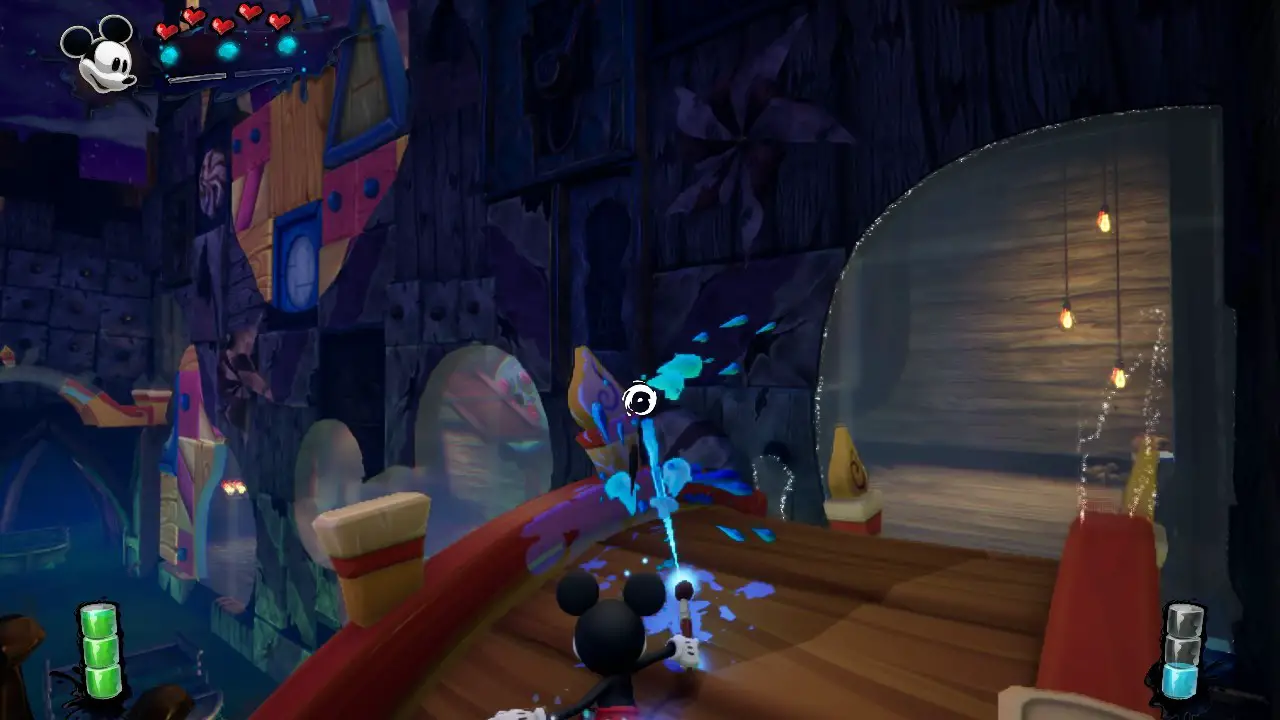 The most noticeable alteration is the visuals. The Wii release was very bright, which went against the darker tone the game was going for. It was also very obviously limited by the console, but now that those restraints have been lifted the visual style can truly shine. Rebrushed is stunning. It’s easy to see a massive amount of work has been put in to fulfill the game’s promise of a darker Disney world, and it pays off. I think Mickey himself looks a bit uncanny in this style, but other characters like Oswald and Clarabelle cow (both of whom I’m still waiting to appear in Kingdom Hearts) look straight out of a modern 3D Disney short. The menus received the same treatment, keeping the paint globs aesthetic and running with it. I do find Mickey’s face in the HUD to be less interesting than the classic drawing of him from the original, but his face’s expression does still change depending on your current health like Banjo-Kazooie which is a cool touch.