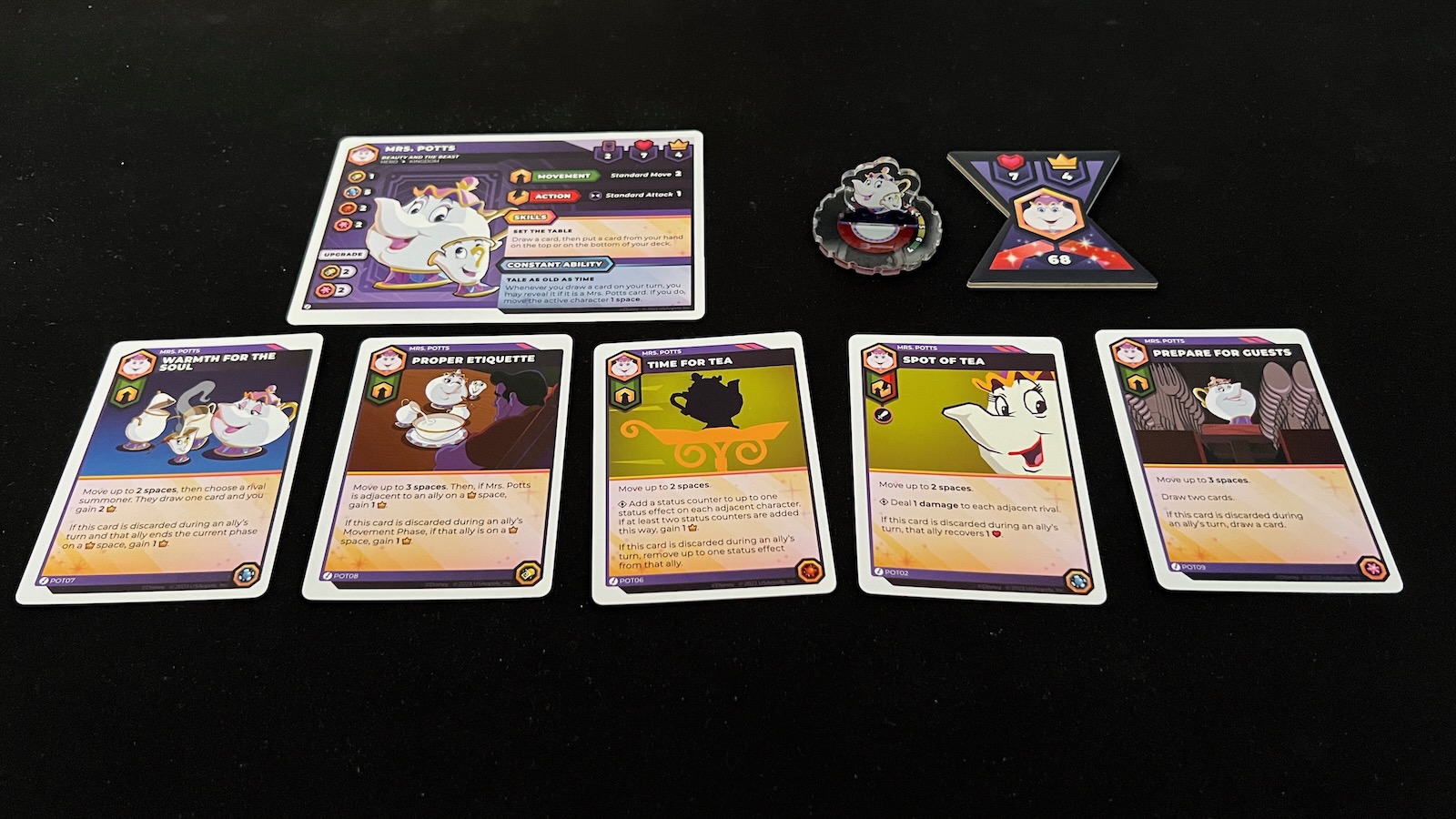 Mrs. Potts is an interesting addition to the character line up due to her low attack value and reward for getting knocked out. Her skills and constant abilities allow the player to manipulate the deck and rearrange cards. When upgraded, Mrs. Potts will give victory points for each character on a crown space. Her deck is really about relying on the positions and actions of other characters on the board. When her cards are discarded, they all give the player abilities to heal, draw cards, earn victory points, or remove status effects, giving Mrs. Potts a great supporting role.