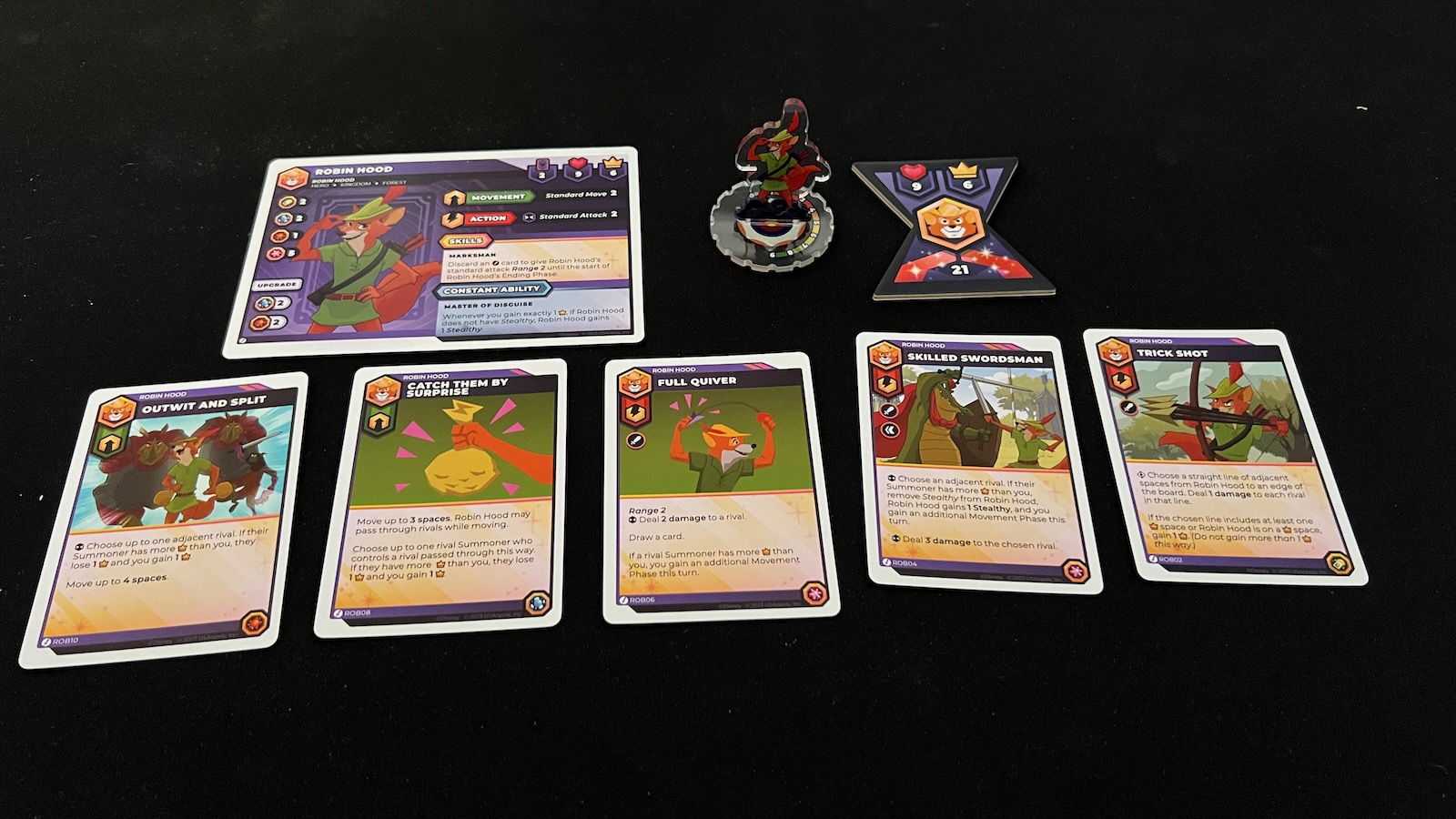 Robin Hood was the character I was the most excited about. I mean, who doesn’t love anthropomorphic outlaw heroes? His skill allows him to discard certain cards to add range to his attacks and his constant ability gains him stealthy when earning a victory point. When upgraded, Robin Hood will steal from a rival with more victory points than him when doing damage for the first time each round. In a similar fashion, many of Robin’s attacks allow him advantages when going up against a rival who is richer, by virtue of their victory points. Many of Robin’s cards hold ranged attacks and ways to earn the stealthy status effect.