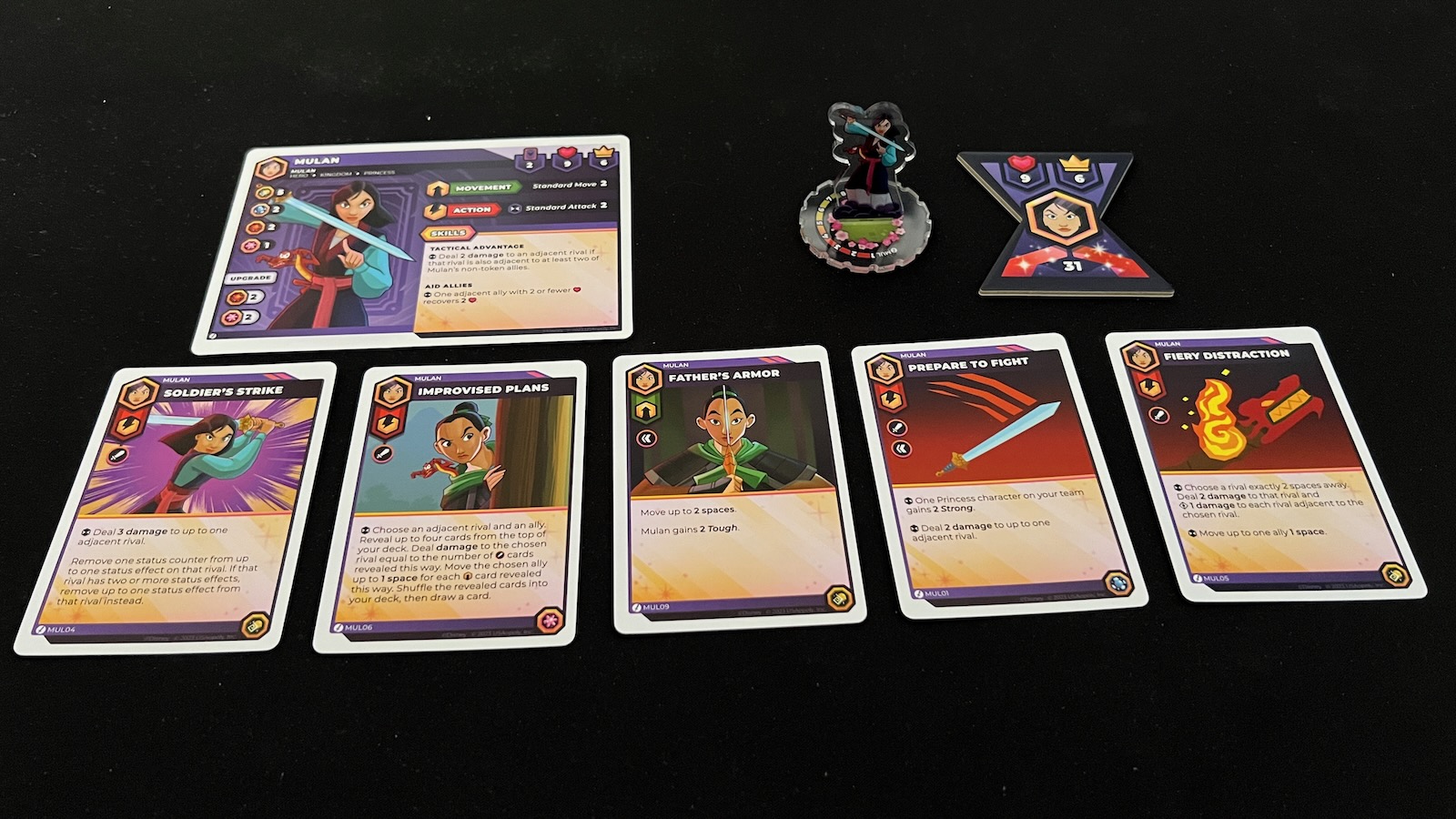 Mulan is a character who shows leadership and can support her team in a variety of ways. Mulan has two skills that allow her to deal damage when an enemy is surrounded by other allies, and healing adjacent allies. When upgraded, Mulan gains a large amount of the Tough status and can use the markers to reduce damage on herself and her allies. Mulan’s deck truly shines when she can empower and move her allies around the board. Her attack cards are useful as well and can also give her the Tough status to take extra damage.