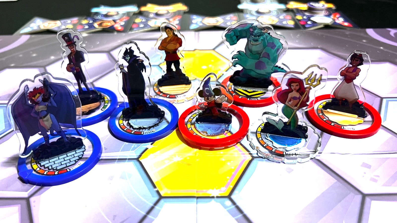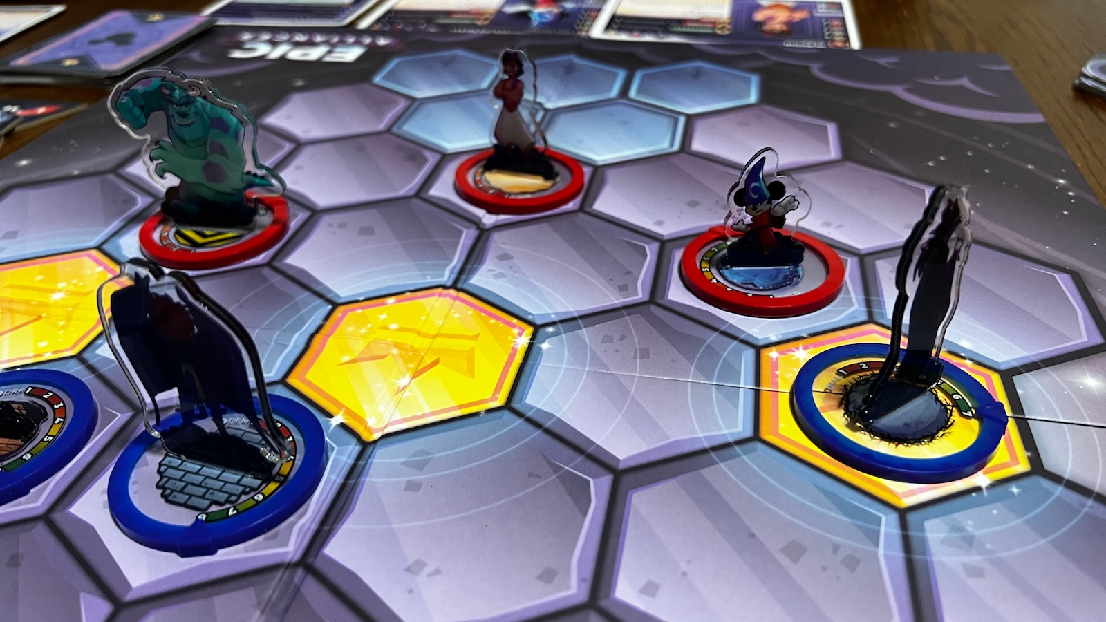 Disney Sorcerers Arena: Epic Alliances from designer Sean Fletcher and publisher The Op, takes the art and the theming from the smartphone app and expertly ports it into a tabletop experience for players of different ages and skill levels. Epic Alliances is a 2 or 4 player skirmish game pitting teams of 3 or 4 Disney and Pixar characters against one another. The game is truly built as a two player game, but has a special set of rules for a 4-player battle royale. Gameplay progresses over a series of rounds with players maneuvering their allies around the board and attacking their rivals’ pieces all in hopes of having the most victory points when one of the end game conditions is met.