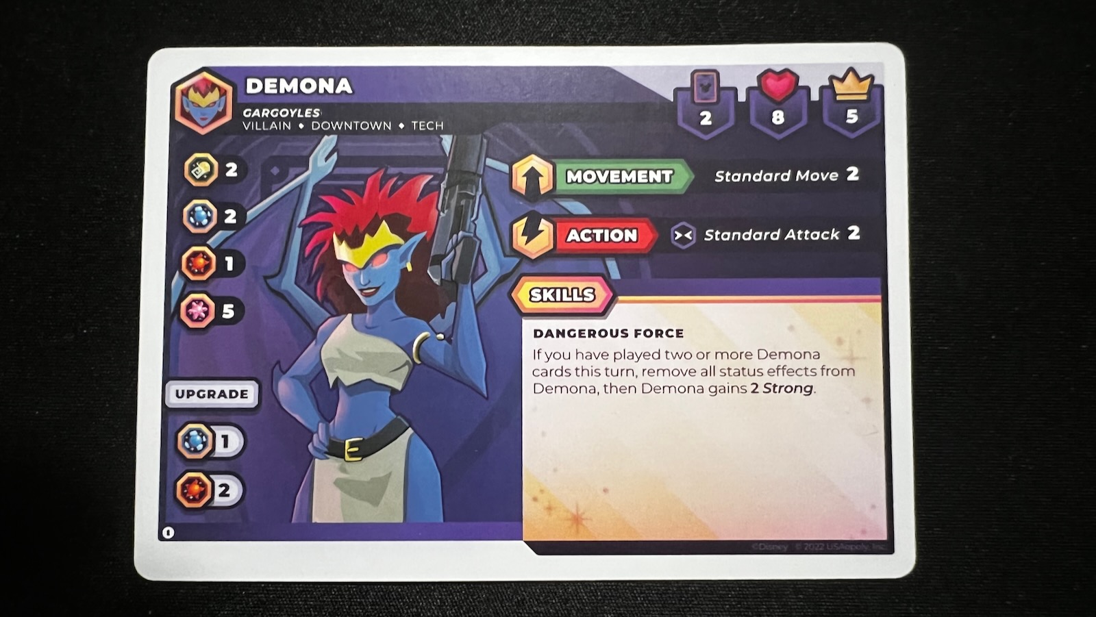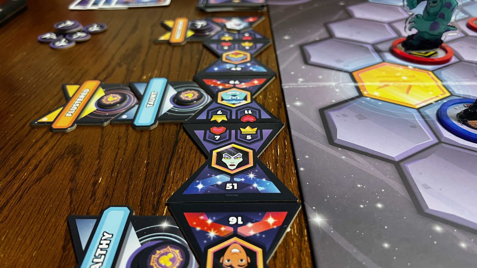 The gameplay of Epic Alliances was much deeper than expected and very satisfying for a Disney game. As a fan of games like Unmatched, you can get much of the gameplay with characters that are mostly universal (Demona from Gargoyles being featured in the base set was not expected). Each character brings a special flavor to the game and as players learn their abilities, they can create teams that balance each other out. Demona brings a ranged attack that helps support Gaston or Sully who prefer an upfront and brute force strategy. Dr. Facilier really uses his status effects and special ability to chip at other characters slowly. Ariel is a great ally to have with her healing abilities and Aladdin can use stealth to avoid attacks and maneuver into better positions. One of the most fun abilities was Maleficent’s dragon form which allows a character to regain health and deal out damage to an opposing character in kind, a great card to play when she was on death’s doorstep (insert maniacal laugh). Another fun element is creating teams of traditionally “good” and “evil” characters who create interesting combos to defeat the other team. This really stretched the fiancé who is generally not combative, but loves all things Disney. The game is also ripe for expansions with one already on the market adding Moana, Stitch, and Davy Jones to the cast of available characters. Having so many characters in the Disney/Pixar arsenal, and keeping some of the heavy hitters out of the core box allows for a long line of successful add-ons to come.