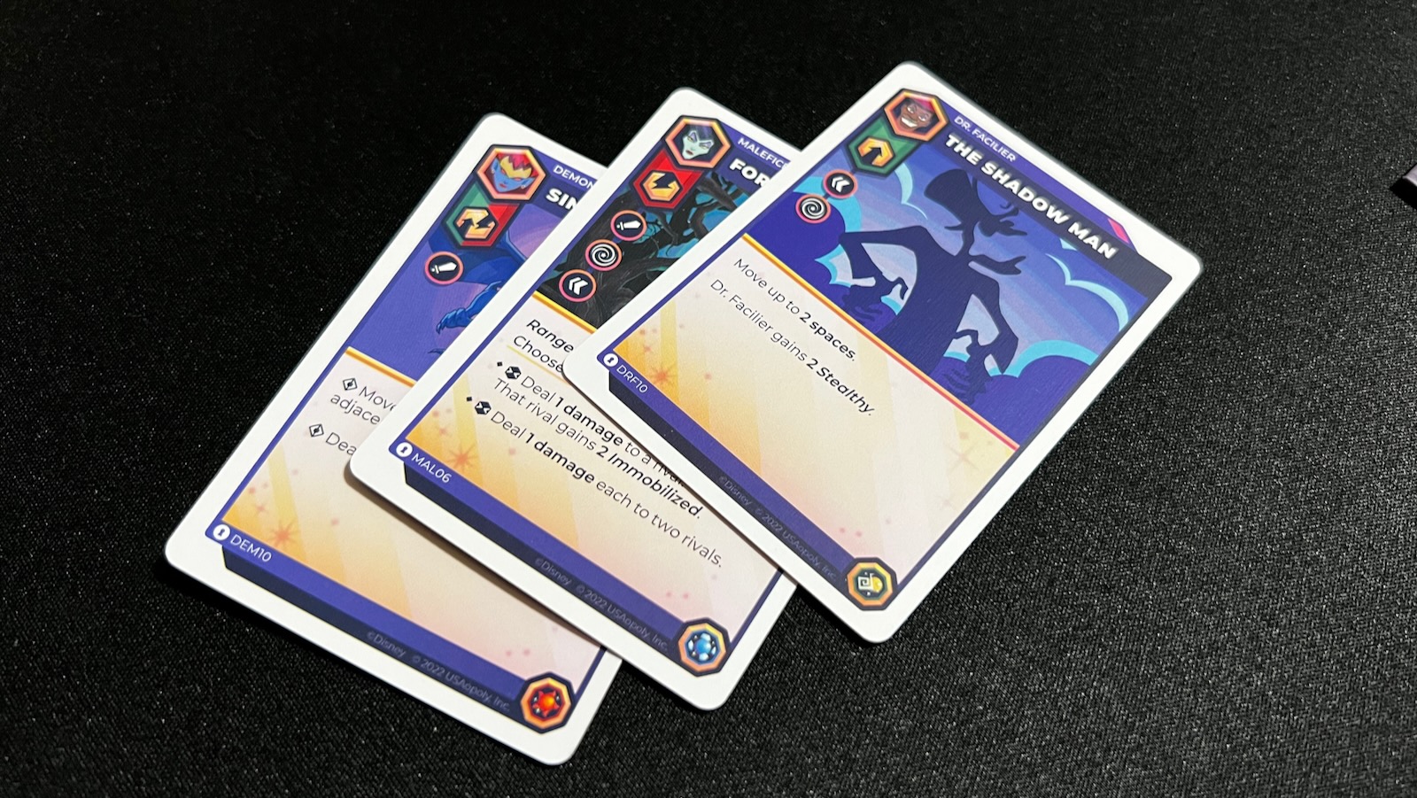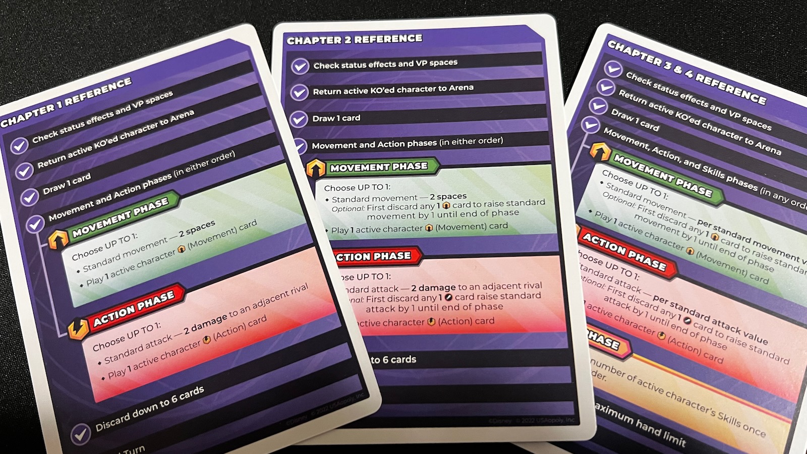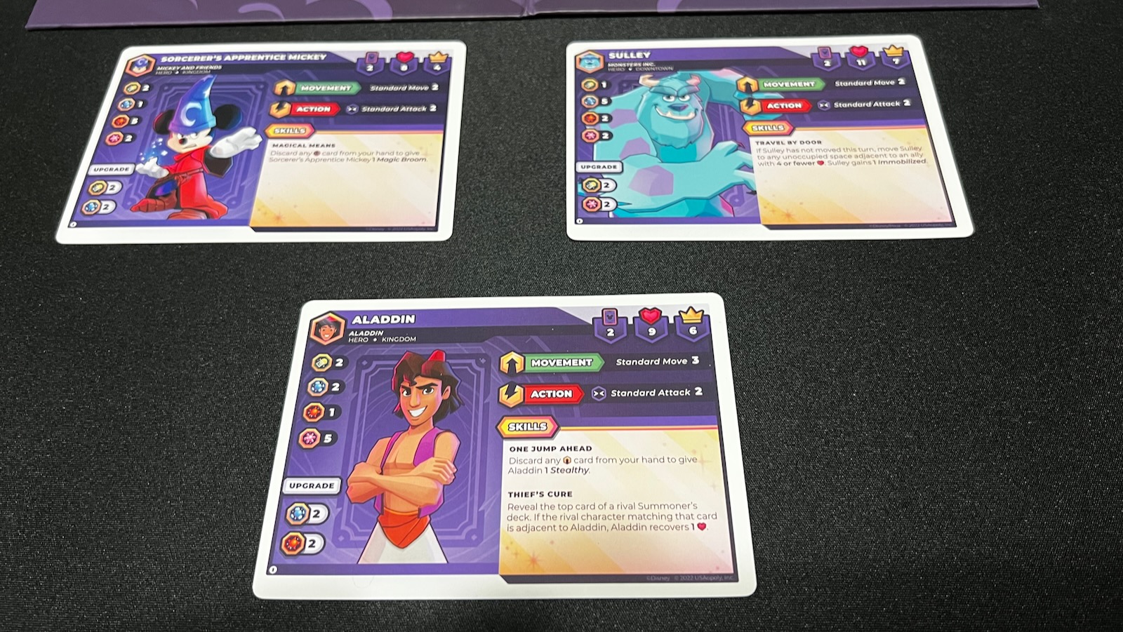 The cards in this game are where a lot of the flair comes out. Each character comes with a special set of movement and action cards tailored to their abilities and backstory from the Disney universe. Cards have a number of tags that can trigger abilities on character sheets and combo with other card abilities played each round. Cards also come with unique gear icons used to upgrade characters throughout the game. As cards are discarded, players keep track of these gears to create sets. Players can then banish these cards from the game to upgrade characters and add even more special abilities.