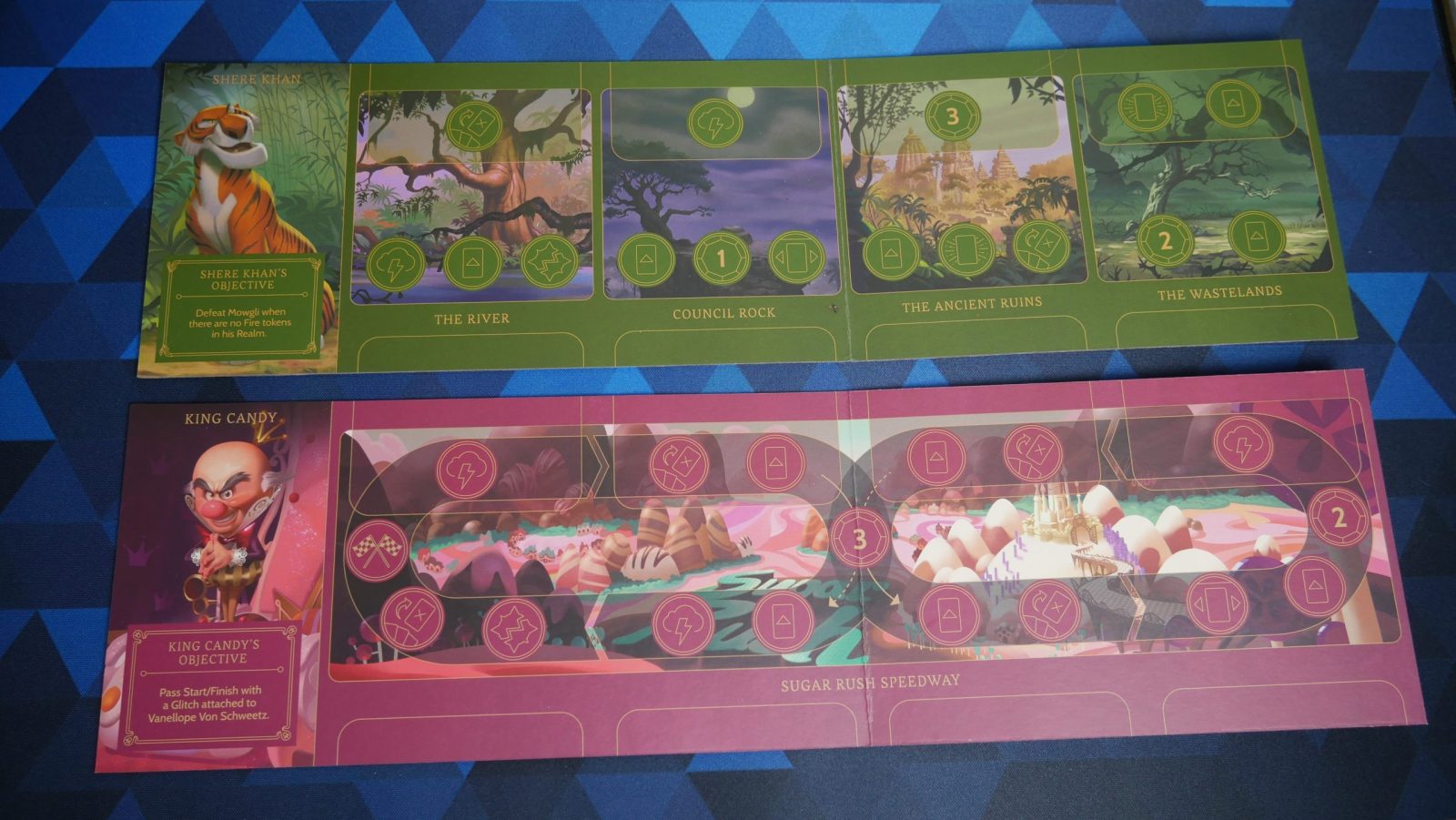 I don’t own all of the Villainous content, but I do have a lot. So much that I’m trying to figure out how to make it take up less space on my shelf. I would fall into the category of people that are happy with the amount of content I have and maybe even feel like I have too much. I’m a sucker for the classic Disney movies though and was intrigued when I saw Shere Khan was going to be in the box. Maybe not enough to want to get the set. When I saw the King Candy racetrack, that changed. While I like Wreck-It Ralph, it is by no means one of my favorite Disney movies. It’s solidly entertaining but not an evergreen like The Jungle Book is to me. What I do love, is innovative board game mechanics. I had the opportunity to interview Mike Mulvihill, the director/designer for this set, before it came out and his excitement for the new mechanics was hard to ignore. Changing up the way you move to select actions may seem minor but the blend of theme and new ways you have to consider and plan out your actions is a really fresh injection of strategy into the game. It could have been a huge blunder but ends up working out really well.