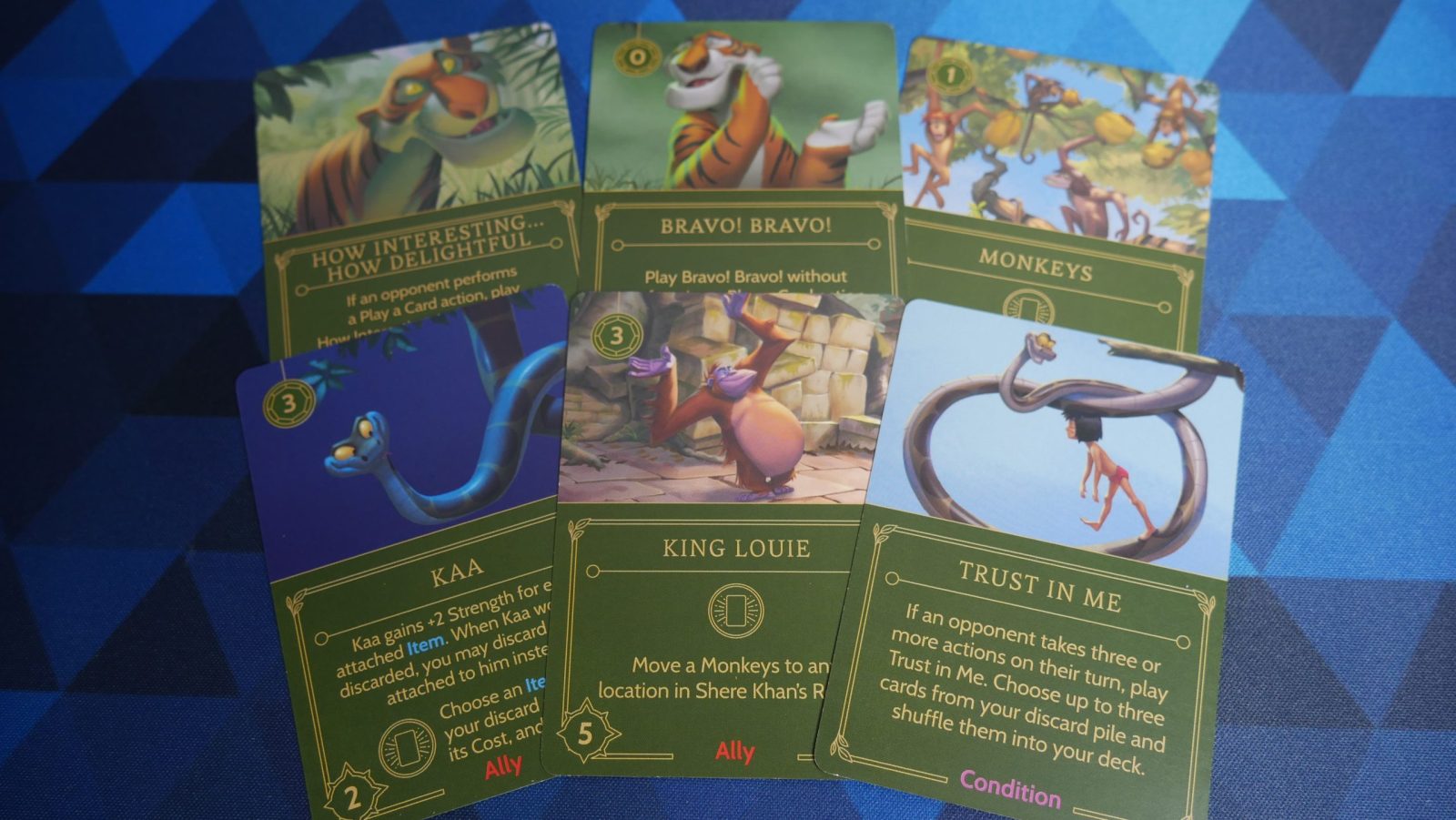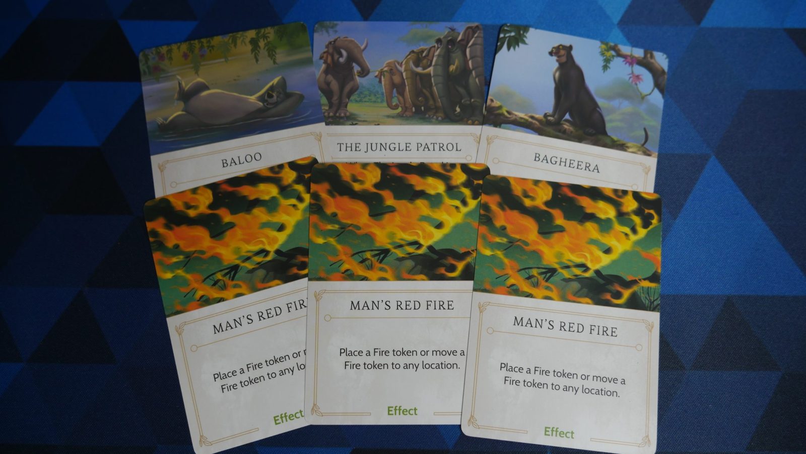 Outside of the fire tokens, Shere Khan plays like a normal villain from other sets. He moves from location to location and needs to find and defeat his thematic counterpart, Mowgli, while adhering to some conditions. Even Kaa defeating heroes without being discarded by shedding item cards has been seen before. As usual, the card abilities and artwork are oozing with theme and movie moment callbacks. Despite playing out similar to many of the other characters, the cards feel alive with your favorite scenes and childhood memories. Therein lies the real strength of this game anyway.