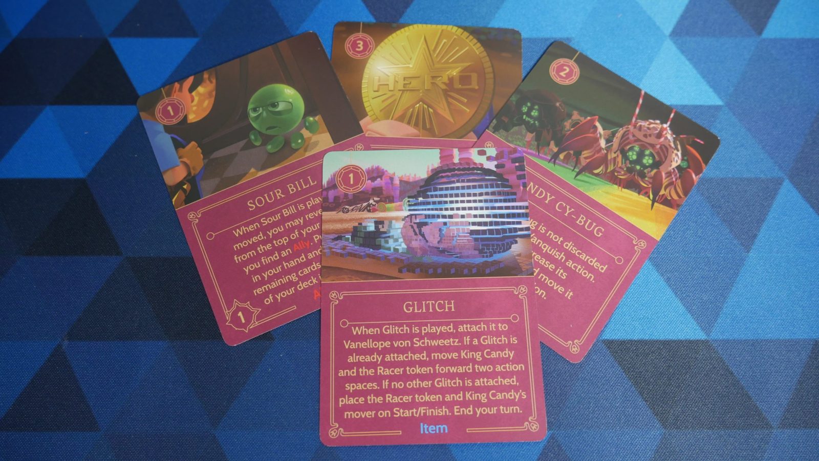 To win the game, King Candy needs to find Vanellope Von Schweetz and play a Glitch on her. Doing so will trigger the Race. King Candy and a token representing Vanelope are reset to the starting line and the Race begins. King Candy must get around the track before Vanelope to win the game. If she wins, the Glitch is removed and King Candy will have to try again. The majority of the ally and hero cards within King Candy’s decks involve moving either racer extra spaces forward or backward or slowing them down in some way. Notably, King Candy only has one Vanquish action space on his entire track so dealing with Heroes can be difficult if you let them build up.