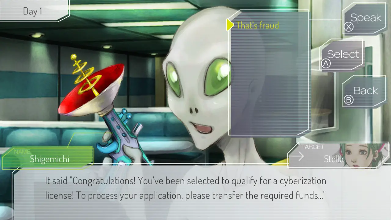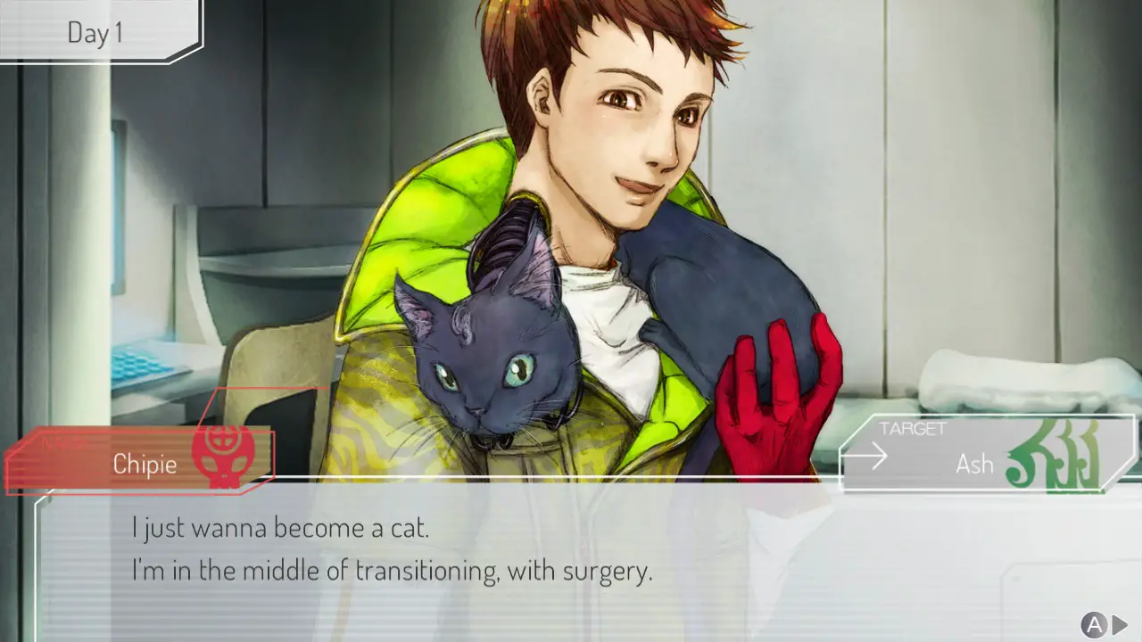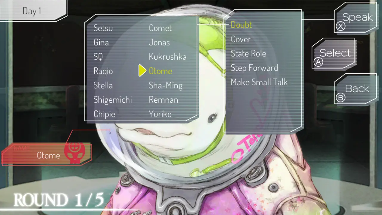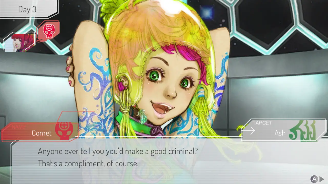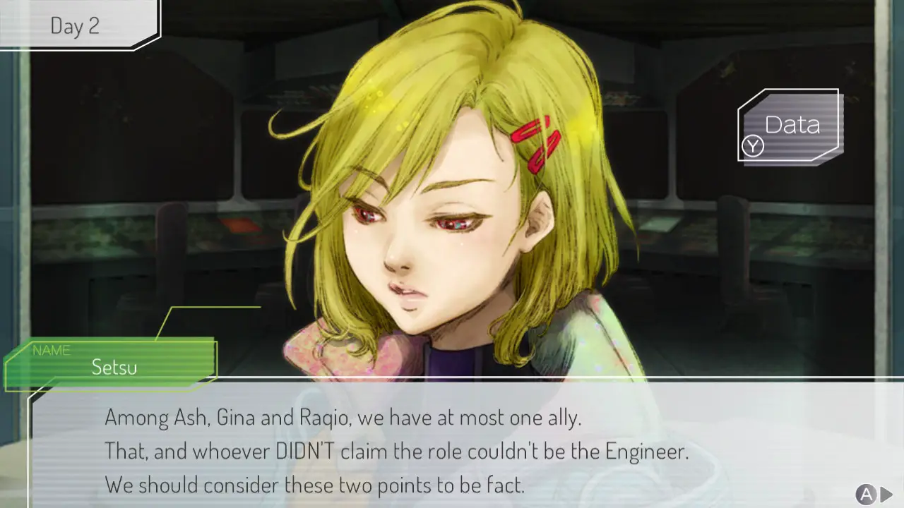 It also helps that the cast of characters is as diverse and unique as the game itself. You know those traits you have when playing the game? Well, everyone else has those as well, which makes the dynamic for trials interesting. Each character has their own personality and habits, which can make or break a loop depending on with whom you’re teamed up. Raqio is a flamboyant yet adamant accuser with high logic, yet can easily be accused if you play your cards right. Likewise, my personal favorite Shigemichi has very high charisma… but has the unfortunate distinction of looking like a traditional alien, which means he’s usually the first to go in a loop. Sha-Ming, on the other hand, is a smooth talker and can convince the crew to turn on someone at a moment’s notice… pray he doesn’t pick you. That said, he’s also a very uncooperative teammate, which makes him unreliable yet a good way to mix up the game. The only other person you know who has memory of the repeating loops is Setsu, who is basically this game’s equivalent to Danganronpa’s Kirigiri. Each of these 14 characters have a great backstory that you must uncover in order to find out the true ending of the game.