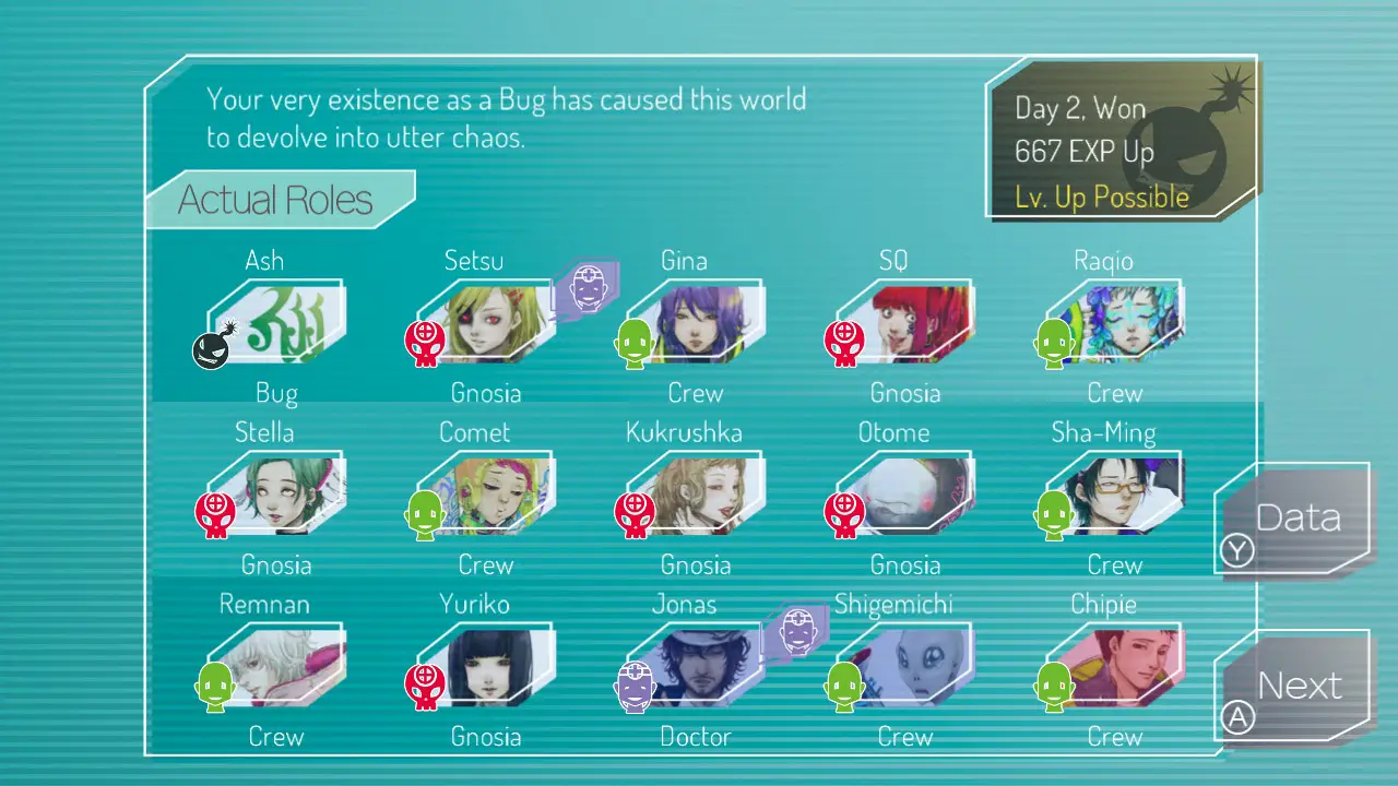 I said for the round, because regardless of whether you win or lose, you’re granted the ability to go back and loop to a different setup, which means there’s no penalty for being brash with your actions. Every loop is randomized, which means your ally for one loop might be your enemy in the next, and you’ll need to investigate who’s on your side. To complicate matters even more, there are different roles also assigned randomly, which can help either the crew or Gnosia side. AC Followers, for instance, are humans that can win if the Gnosia do and therefore must stay alive with them in order to win. Engineers can determine once per night if a selected crewmate is crew or Gnosia, while the Bug will win if they aren’t eliminated by the time a faction victory is decided.