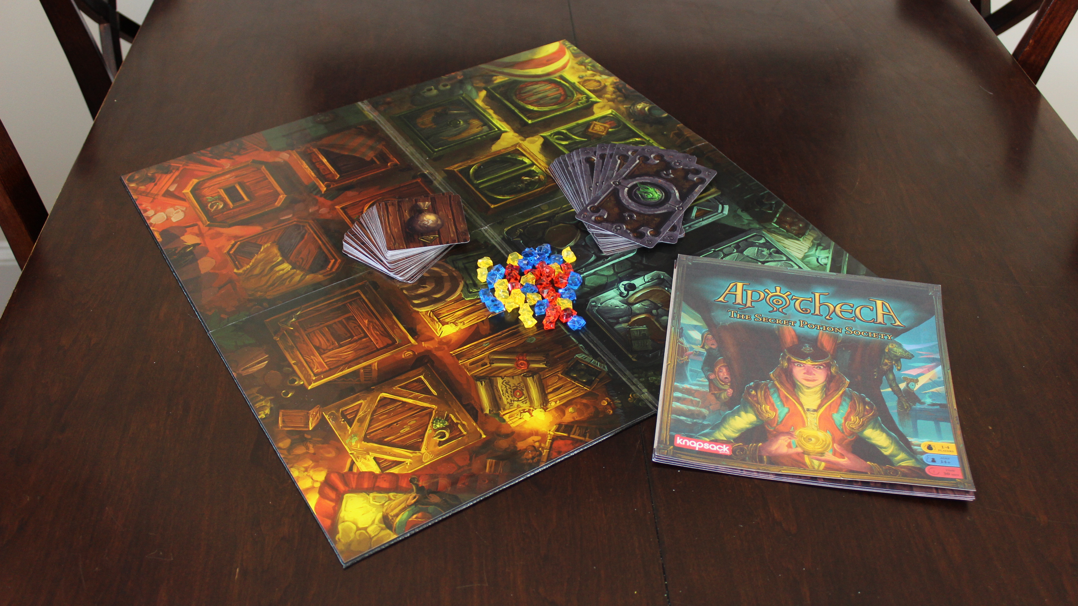 As of this posting, Knapsack games is looking for support to fund their latest design: Apotheca, The Secret Potion Society. This is a review of a pre-production prototype of the game, so the included images are of inferior quality to the planned components, however the gameplay and rules are representative of the final product. If you are interested in more about the project, more can be found here.