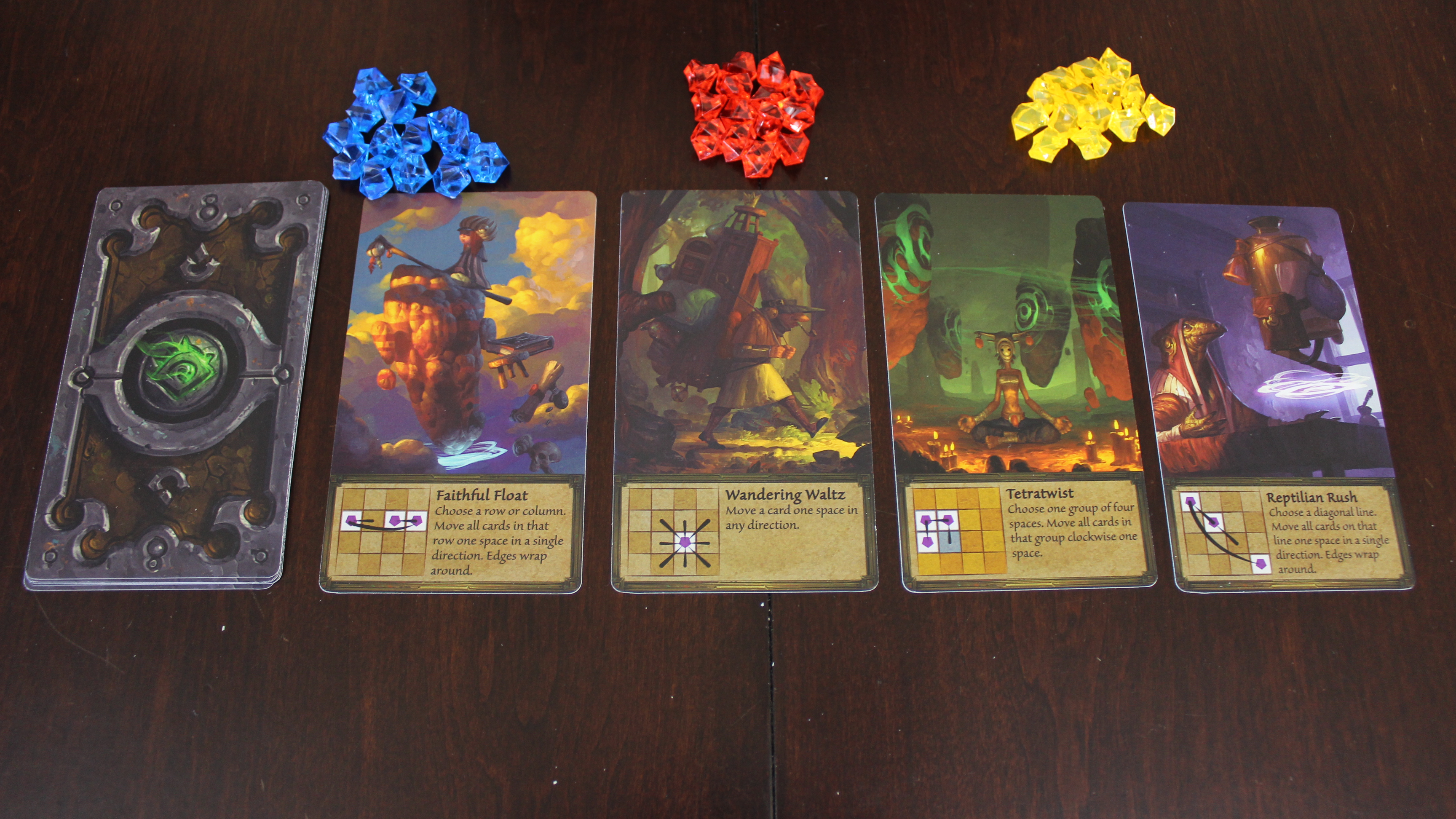 The last two actions revolve around the various apothecaries a player can use to manipulate the board. Each apothecary has an associated power that can be used. These powers all revolve around moving or switching potion cards. For example, one personality allows the player to move any card in an ‘L’ pattern (al a knight). If the outcome of a apothecary’s power also satisfies the three-in-a-row goal, that set can be removed and scored. These are the two primary ways for scoring sets, either flipping cards or moving them around. The only other action a player may perform is turning in gems to hire a new apothecary personality. Play goes back and forth, each player taking two actions, until one player has scored three sets. This player is obviously the best alchemist and the winner.