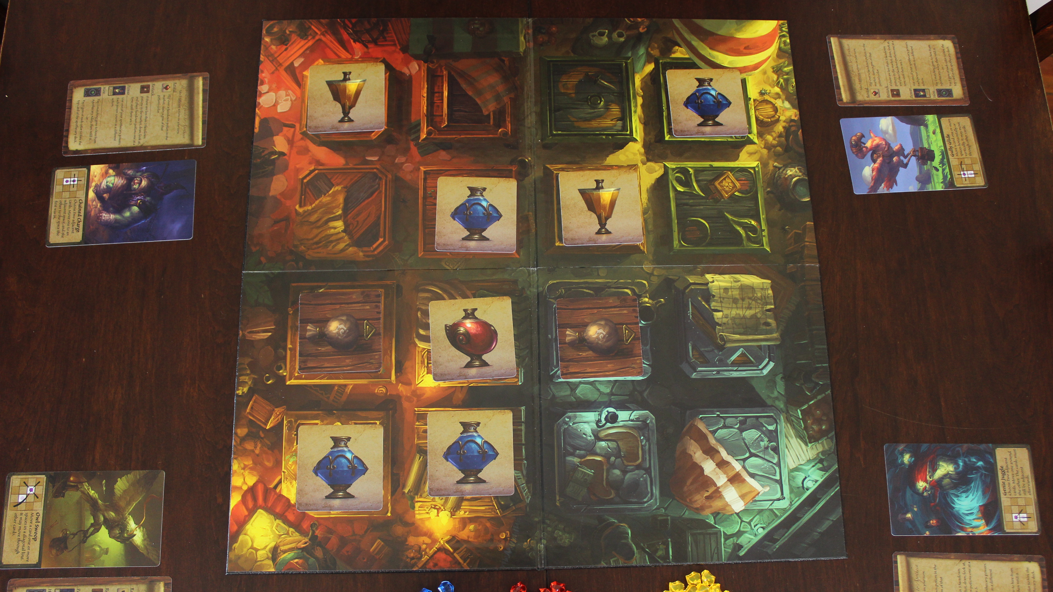 The focus of Apotheca is the board where various potion cards are going to be placed and moved around in a four by four square grid. The potion cards come in three different colors: blue, red and green. The goal of the game is to arrange, or flip, a set of cards to form a line of three matching potions. Assuming the player has an apothecary to claim this result, the set is scored and removed from the board. Once a player has done this three times, the game is over with that alchemist being declared the winner.