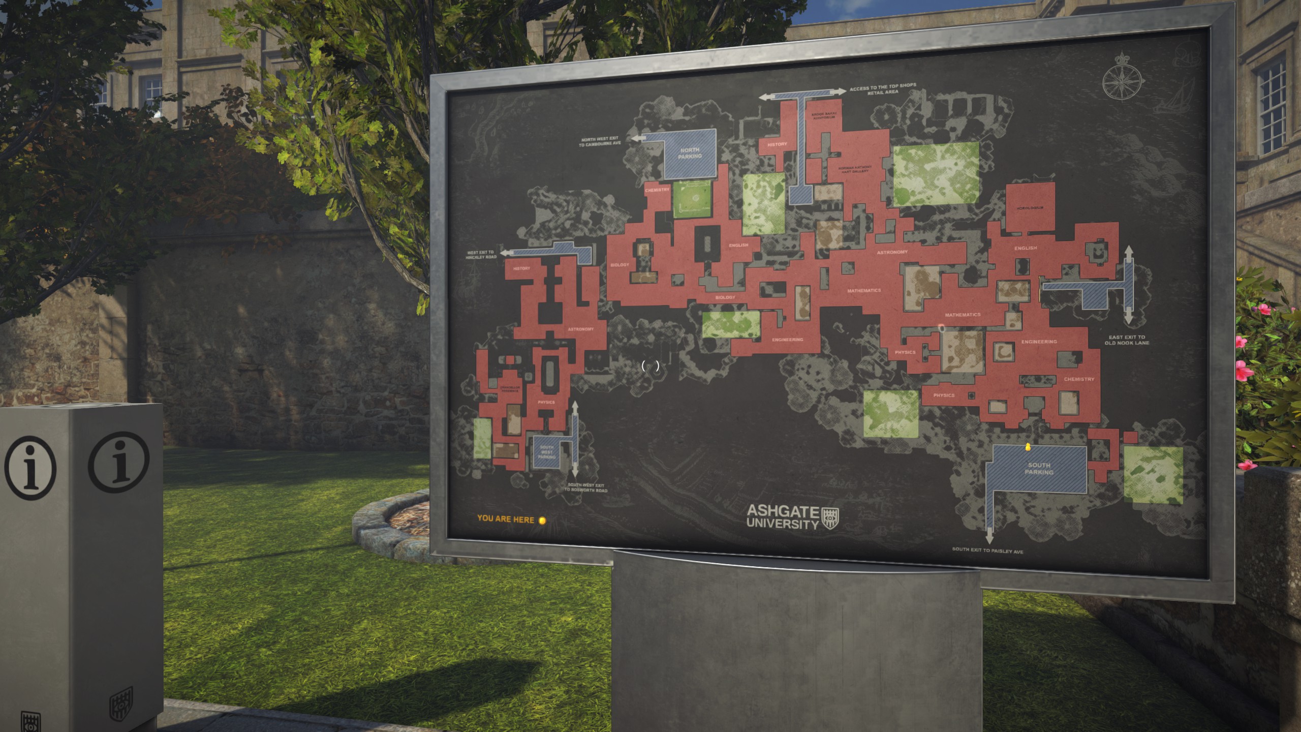 There was one point where I went through the outside of the campus to explore, walked over a specific point on the path, fell halfway through the floor, then I was slingshotted back and forth while the game attempted, and failed, to relocate me back onto the ground.