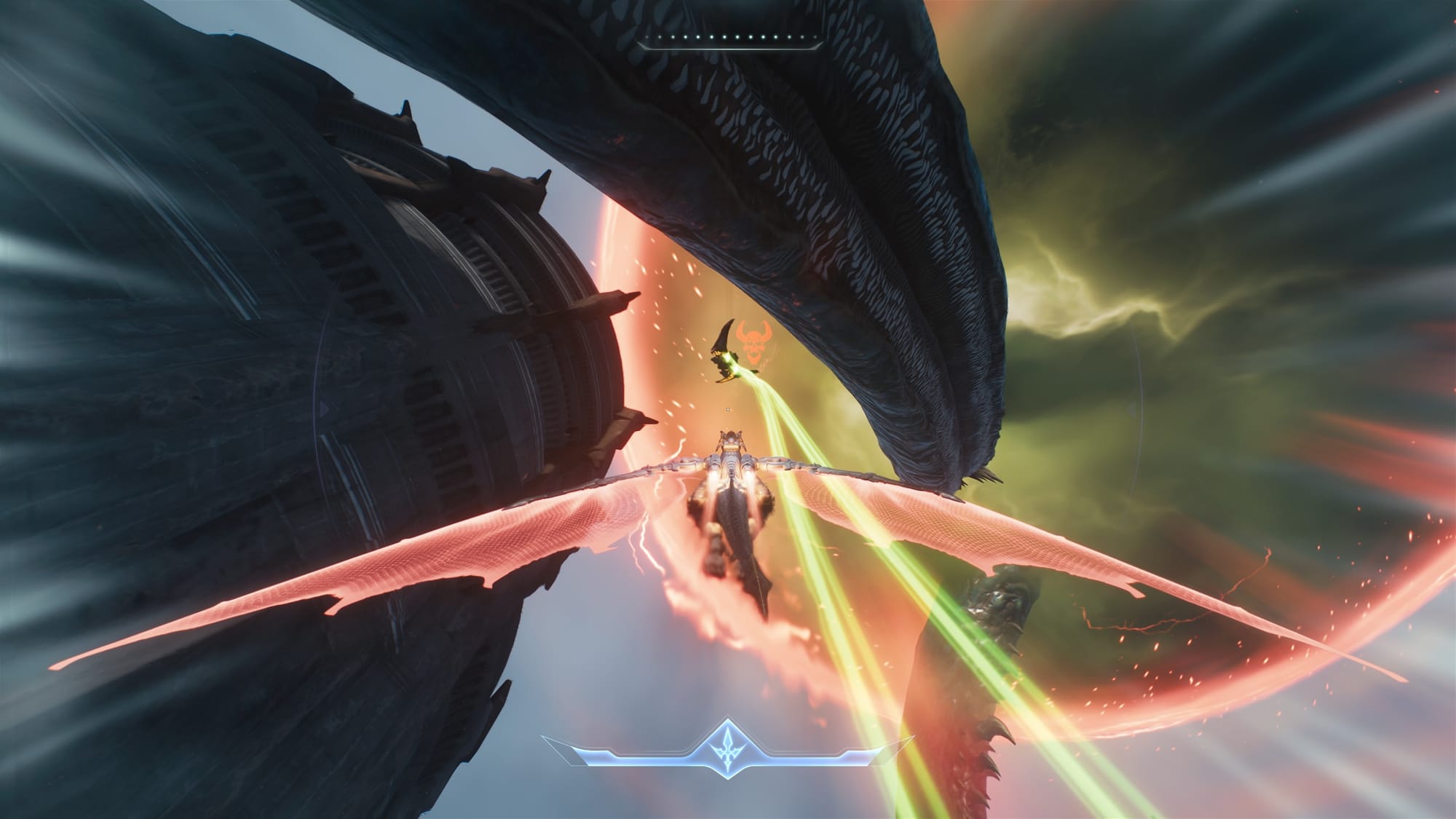 Essentially, you hold down right click to target an enemy, which places you in a specific location to hover. You then hold left click to shoot, and move with WASD then press space to dodge. Moving really only determines the direction you dodge rather than strafing around the enemy, and you do need to dodge in specific directions to avoid attacks here. Dodging a green shot will slow your turret down, but cause it to deal special damage that pierces enemy shields, meaning the perfect dodge is required to defeat most foes here. It’s interesting at first, but never gets more complex than that. Unlike the Atlan, there’s a much more interesting gameplay style right there for the dragon, but it is entirely optional and rarely appears.