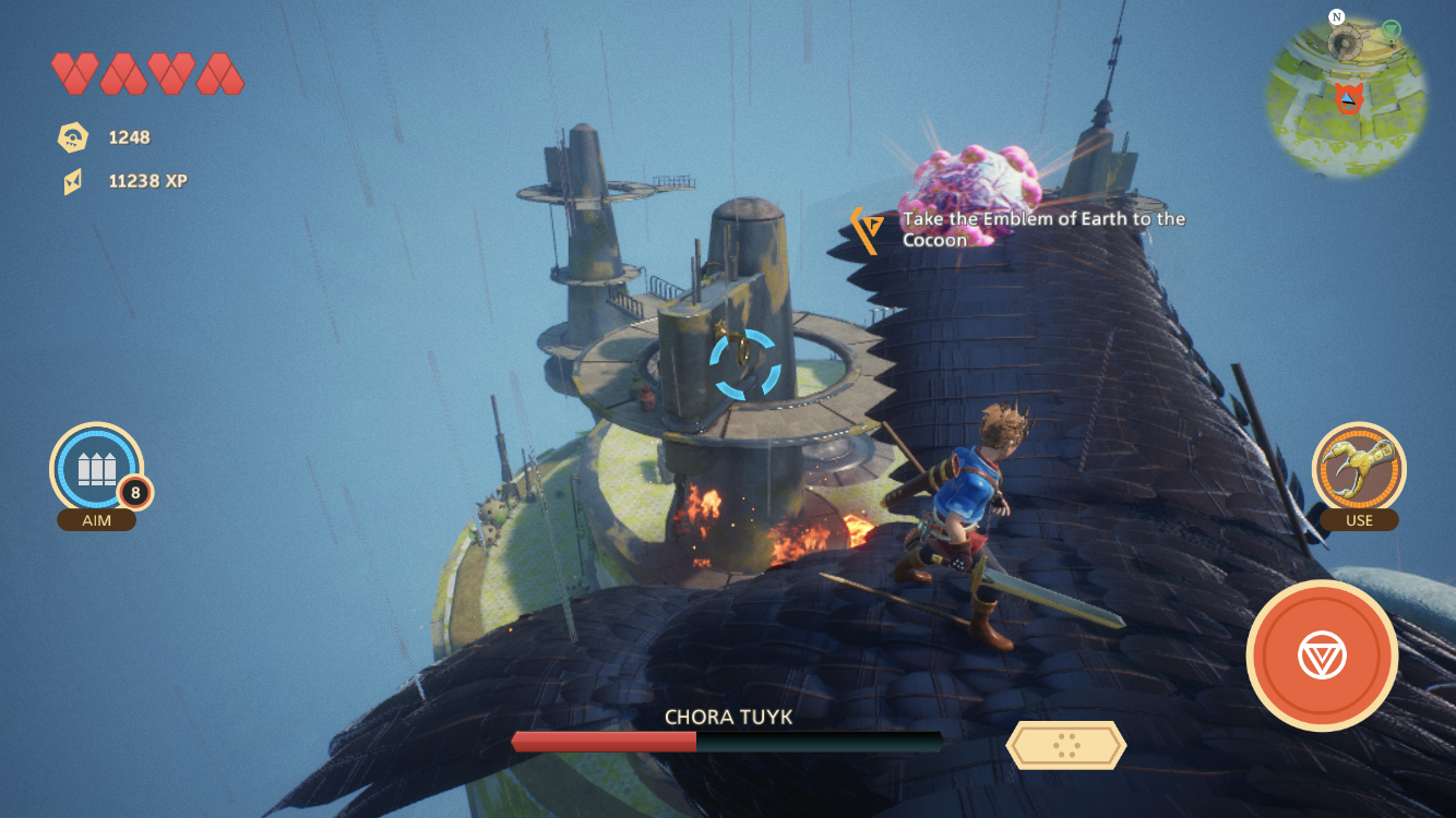 Puzzles in the game can feel either obtuse and confusing or deviously clever; there is no in between. On one side, you’ve got puzzles where the game expects you to shoot a fire charged bullet through the solid wall of a tower to light the brasier on top, while on the other are puzzles where you must weigh down a switch with a pot to lower a platform, then blow it up with a bomb once you’re on top of said platform to raise it once more. While the former are more common than the latter, it’s still extremely satisfying to solve those few brain teasers. You’ll be solving said puzzles with the same tools you use in combat, namely your sword, shield, and caster gun, which can shoot normal or elementally charged ammunition. Sword and shield combat is essentially just mashing the attack button and blocking or dodging when your opponent attacks, while also using your gun to defeat foes at long range. It sounds simple, but the game gets a lot of little things wrong that add up to make combat a chore. First off, there’s no lock-on function to keep track of the enemy. Well, that’s not entirely true: the Knight and the camera will face an enemy while holding the shield up (which you can only do by selecting the item when in touch controls, a controller has you holding the right trigger), but try to attack or dodge and you lose that lock immediately. Aiming your caster gun feels sluggish and imprecise as well when using a controller, which makes the best strategy in every situation excluding bosses to just mash the sword button and pray you hit something before you die or have to heal while Trin and Gen watch you suffer. When fighting a boss, conversely, you’ll need to find a way to make them vulnerable, then attack their glowing weak spots.
