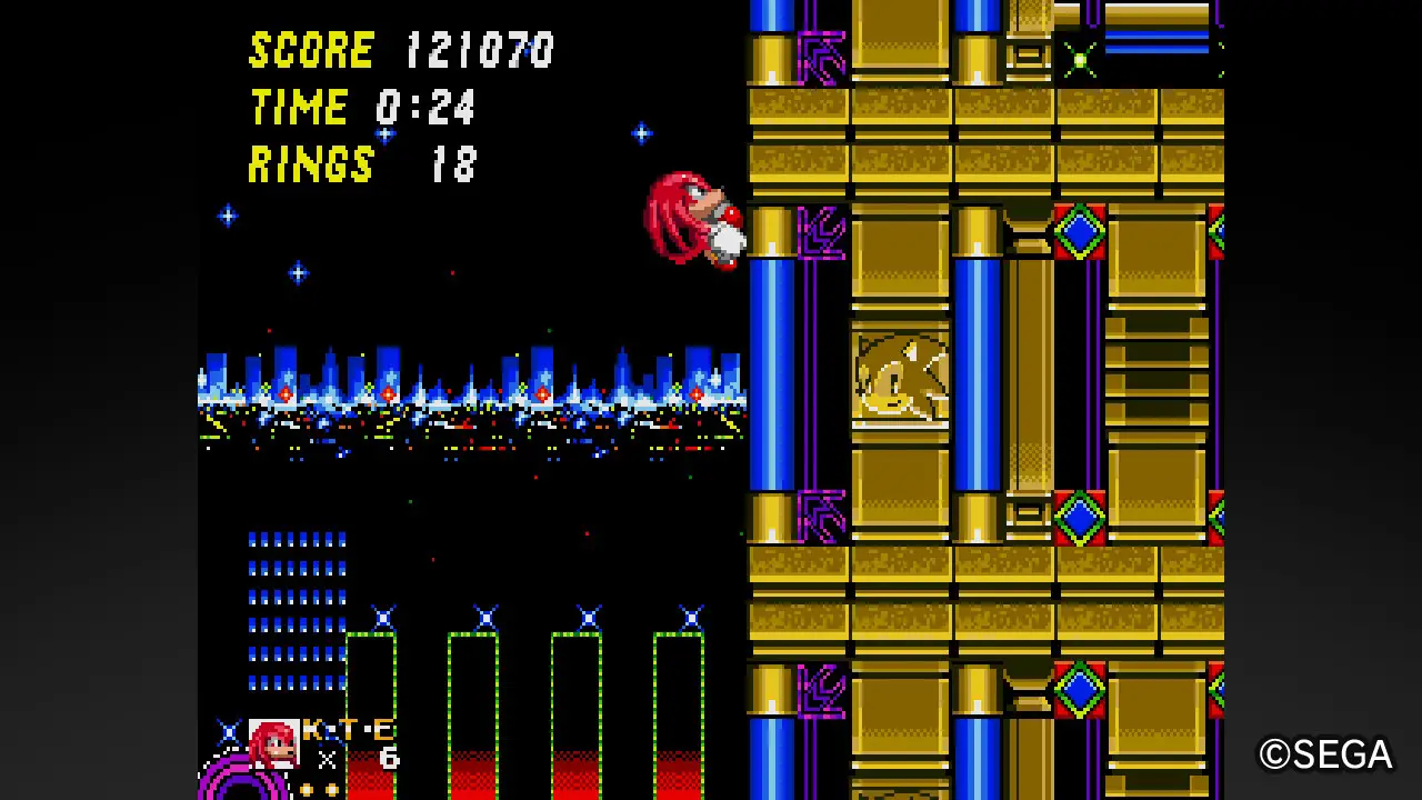 Finally, there are quite a few new modes to change up the core game a bit. Ring Keep mode, as its name suggests, allows you to keep half of your rings upon taking damage, and grants 10 rings at the start of each stage. It does feel a bit like cheating, but it’s nice to have if you want to run through the game quickly and it makes some of the annoying zones more bearable. After beating the main game once in either normal or Ring Keep mode, you unlock Super Sonic mode which gives you the ability to transform into your super form right at the beginning of the game, no chaos emeralds required. Just like the mobile ports, you can also do all of these things with Knuckles, who was introduced in Sonic 3. It’s very clear that these stages weren’t designed with his ability to glide and climb up walls in mind, but it’s a very welcome addition nonetheless. There is also a small challenge mode for both Sonic and Knuckles, which tasks you with going through the first stage as quickly as possible while collecting 100 rings. I didn’t find this final mode as engaging as the rest, but those who enjoy climbing online leaderboards will find something to satisfy that urge here in addition to the game now keeping track of how many rings you can collect without getting hit in a single playthrough.