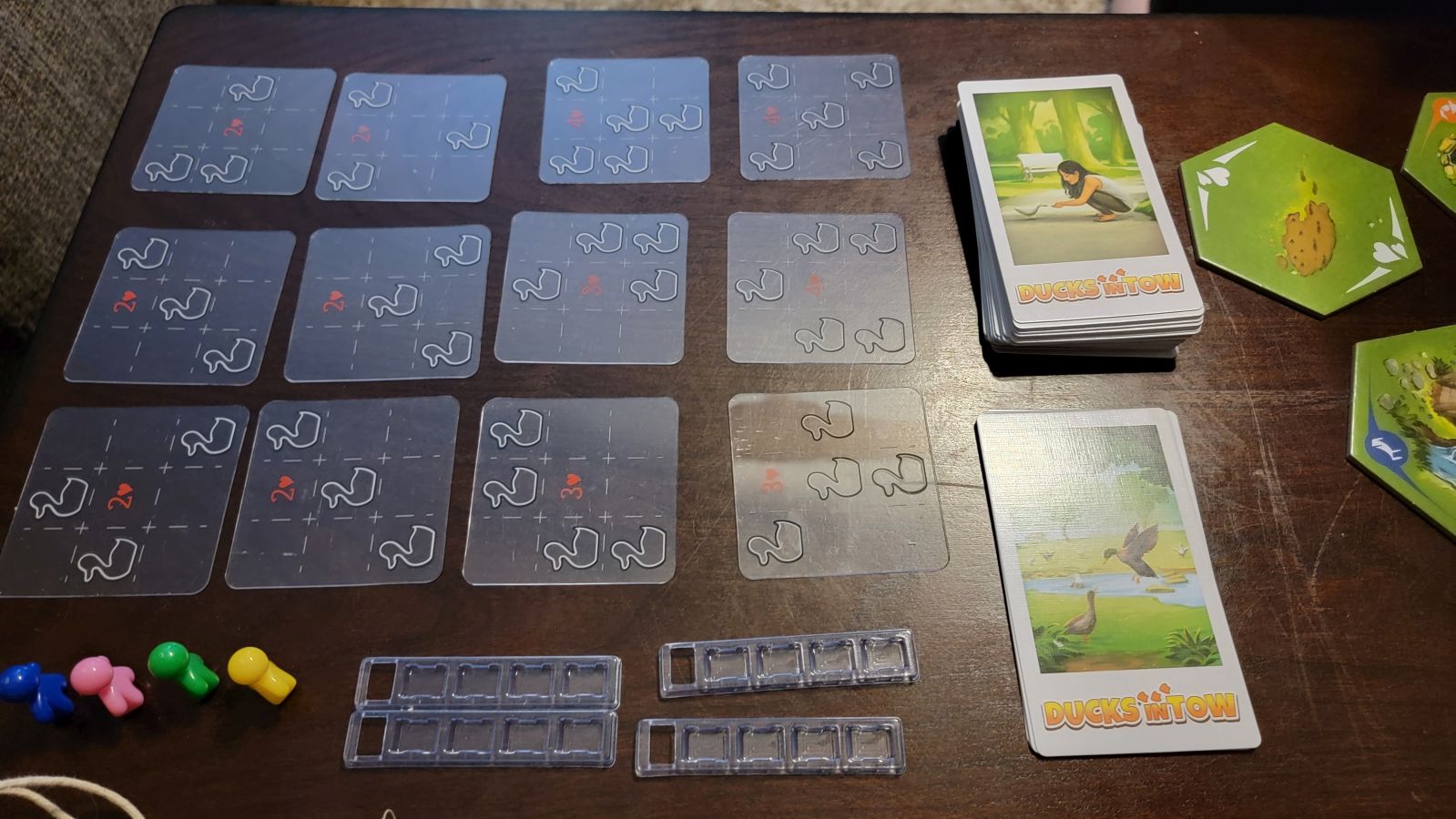 Two bags, one containing ducks and one containing food pellets, are then set up for play. The number of ducks available is based on player count, but there are four colors of ducks and four corresponding food pellet colors. At the beginning of the game ducks will be chosen at random and one duck will be placed on each hexagonal board game piece. Players then place their pawns in their designated starting positions. These pawns fit snugly at the front of a plastic row, which has additional spots to hold up to four ducks. Each player gets a starting card which features a duck formation which the player can build out from, and players will lay this card down in front of them. Finally, players will shuffle and pull out the designated number of formation cards, which can be later used to gain additional points.