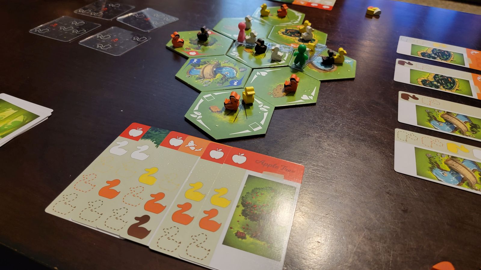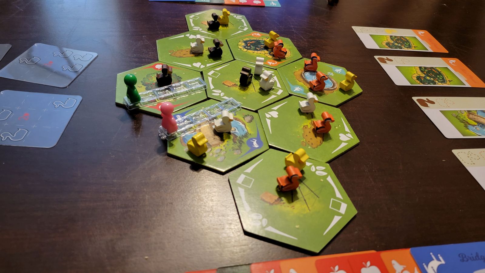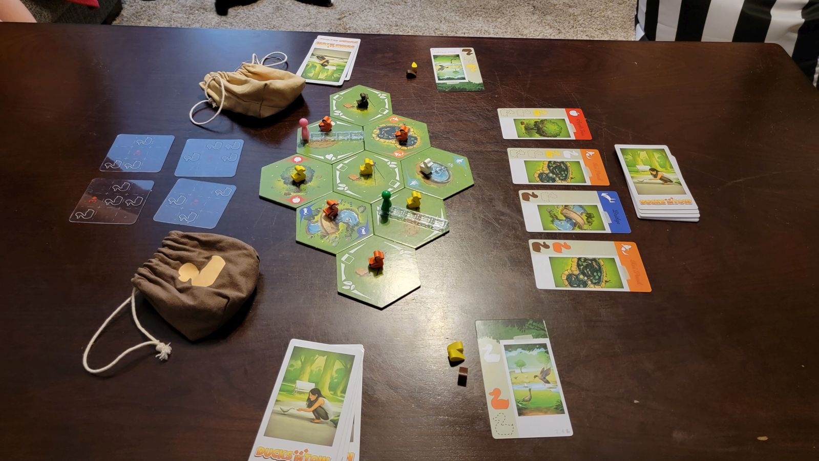 After a player completes their turn, three actions happen. First, if they had completed a drop off, all the ducks they dropped off, plus one additional duck pulled at random from the duck bag, are then placed back on the board. Then food pellets and location cards are drawn until the player is back to four of each. Play then proceeds to the next player. The game ends when a player reaches eight completed location cards, after which points are tallied.