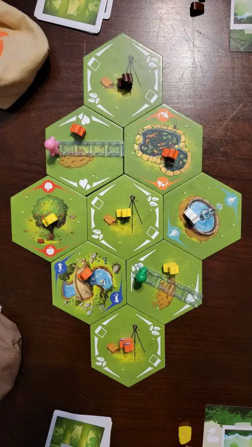 Set up for Ducks in Tow depends completely on the number of players involved but consists of laying out hexagonal shapes in a predetermined pattern. The more players, the larger the board you will construct. A few of the pieces are set, while others are pulled and placed at random. The random pieces act as the drop off destinations and determine the location cards which will be used for that playthrough. Each location card lists a drop off location along with what ducks need to be following you for you to be able to make the drop off. Players will then be given four random location cards and the remaining location card deck will be placed in a central location, with four location cards laid out and visible to all. The location cards in your hand are to remain secret from other players.