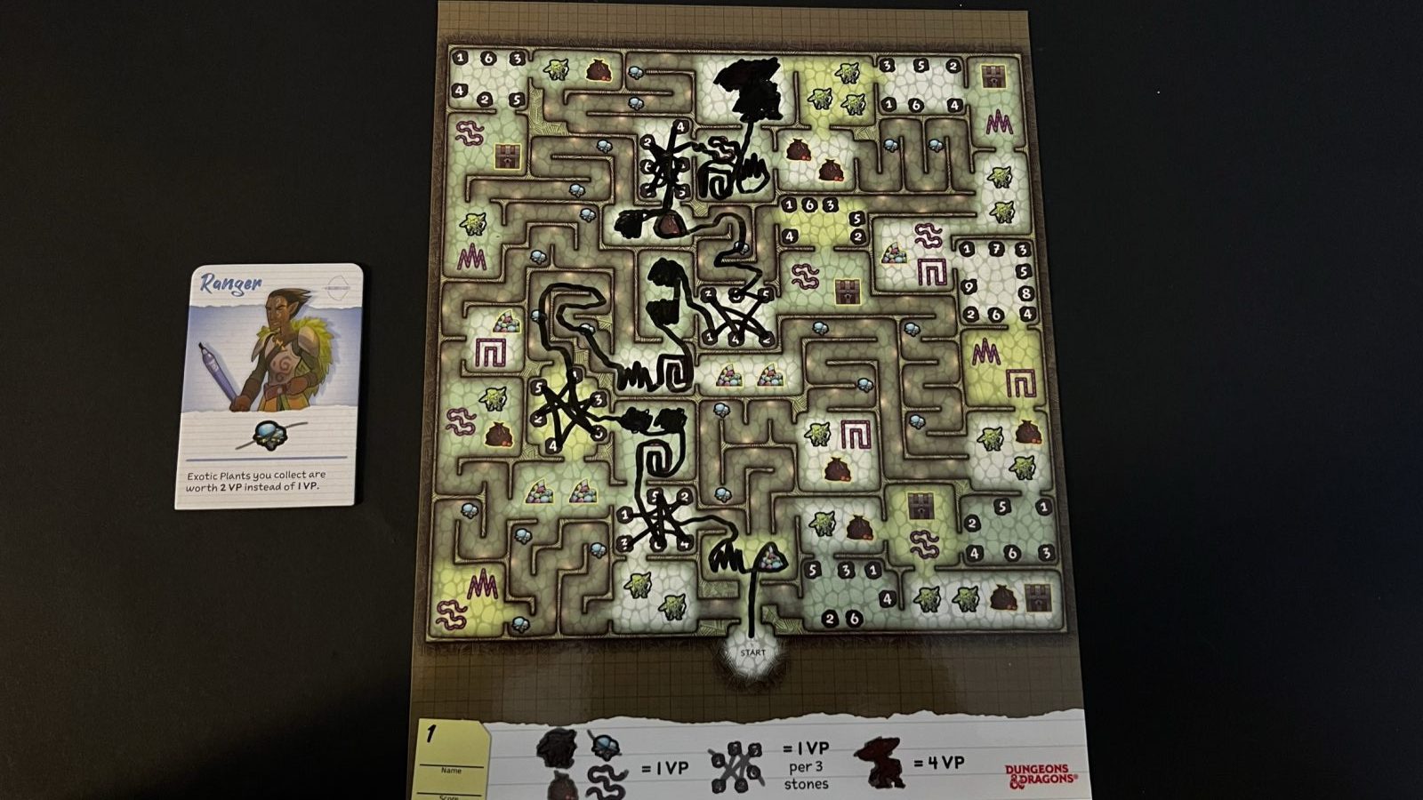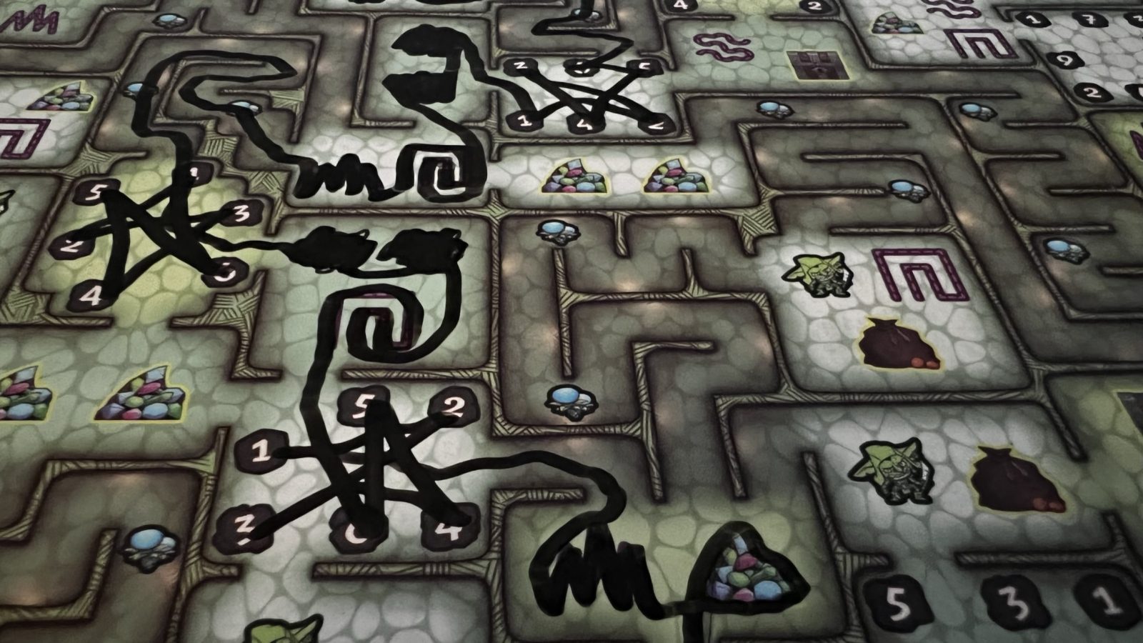 At the start of the game, the players choose three dungeons to explore out of the eight provided. Dungeon 1 is considered an introduction and then each set of three going forward get progressively more intricate and difficult. A round has all players starting at the entrance and keeping their markers on the boards at all times as they set off in the dungeon. In the rooms, different elements pose different drawing challenges. Monsters must be completely drawn over, spells cause the player to draw over unique shapes, treasures must be outlined, exotic plants just need to be drawn through, and artifact fragments must be picked up in a specific order. The dungeon boss must be completely drawn over like other monsters, but the creature is much larger.