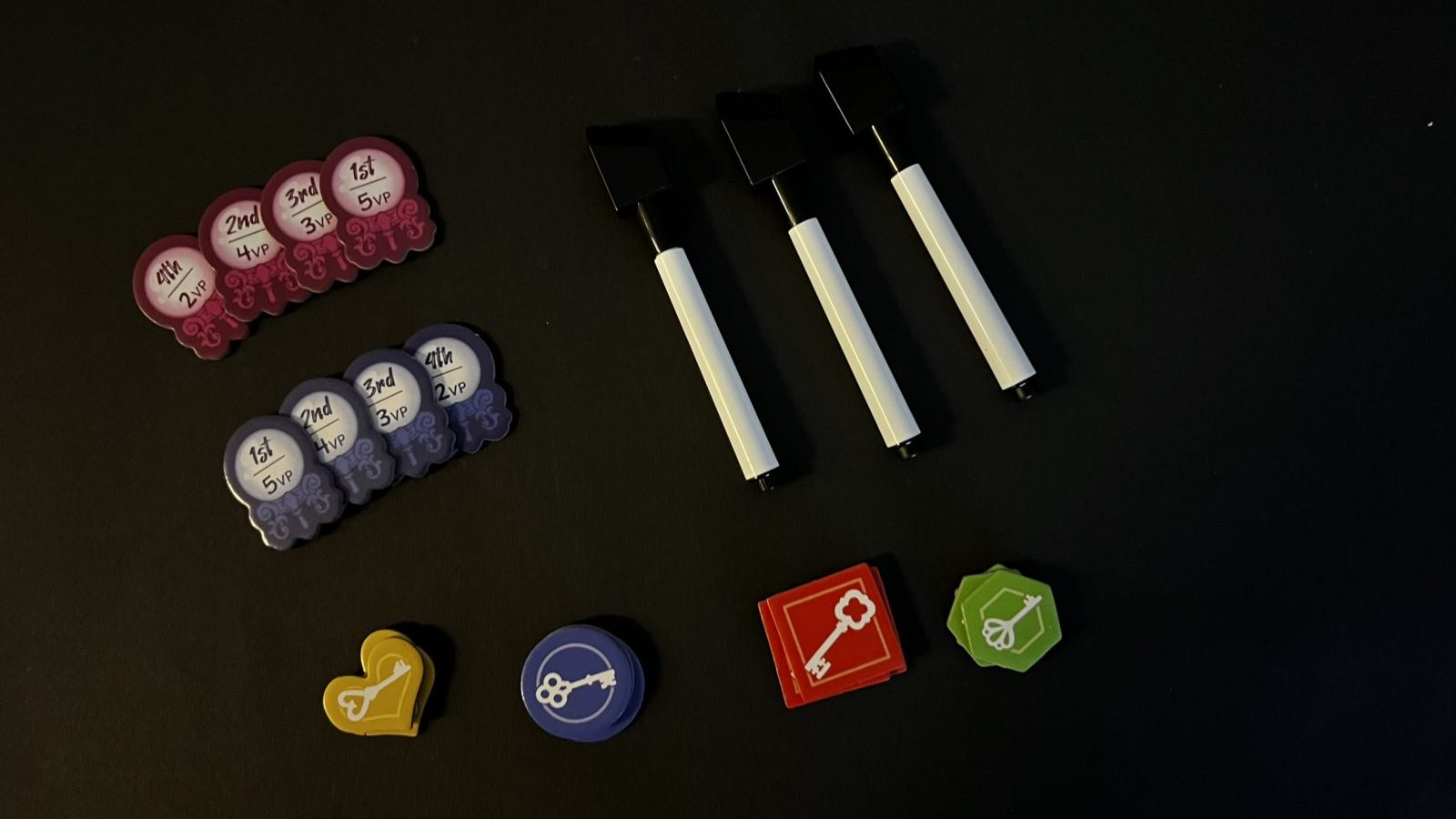 As the dungeons get more complicated, new elements are introduced. Orbs offer variable scoring based on who fills in the blue or pink orbs first. The first player gets the most points and each player in succession gets fewer and fewer points. Portals allow players to transport their marker to a different location on the board and some dungeons even provide an escape portal to end the round in an alternate way. Some areas of the dungeon can be locked. Once a player finds the key, they must grab on the key tokens from the center of the table before they are allowed to progress into those areas. With only three keys provided, they become a hot commodity in four player games. In some dungeons, you can also rescue prisoners that grant you points as well. Scoring at the end of each round is done by another player in the group. Points are awarded for completing room elements and points are lost if an element is skipped or if a player draws their marker through a wall. After all three dungeons have been completed, players will add their scores together for their final total.